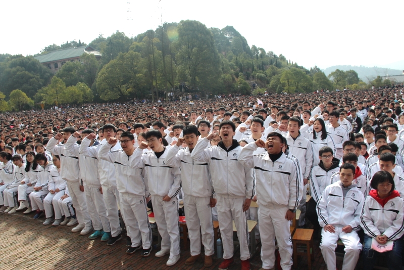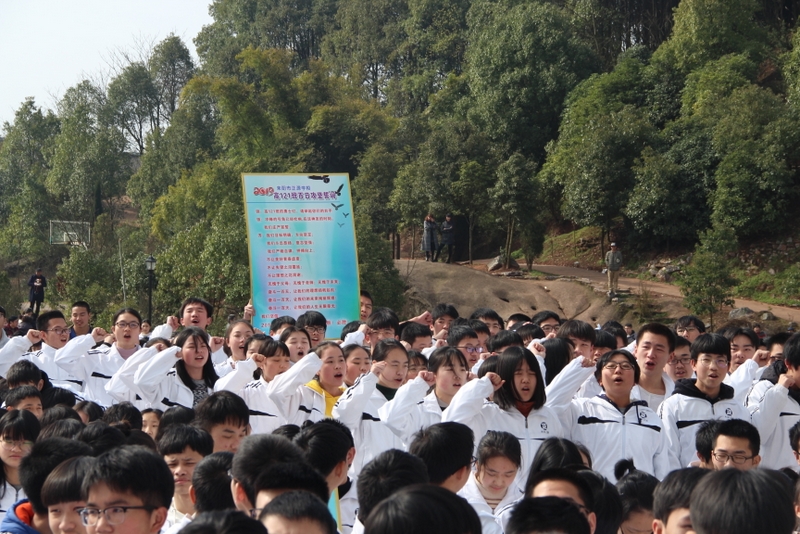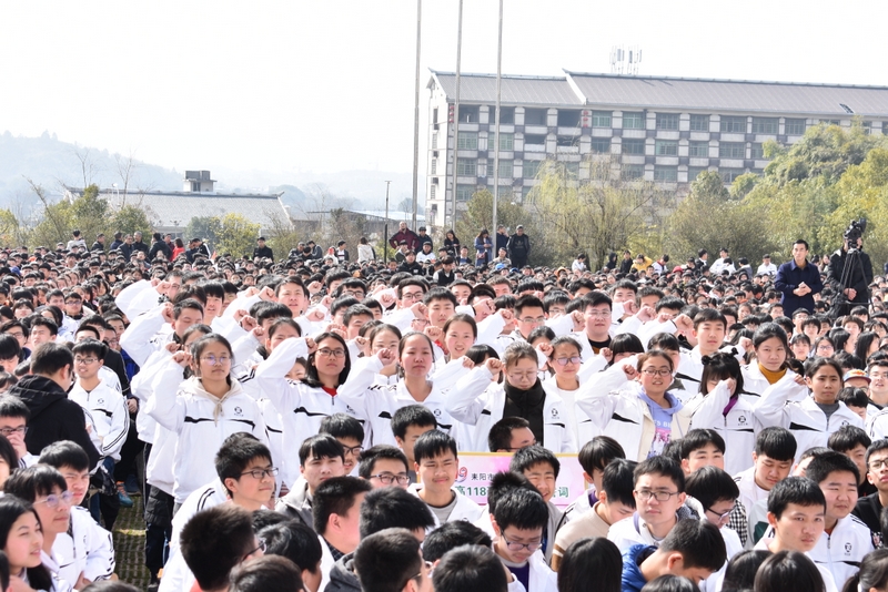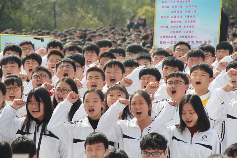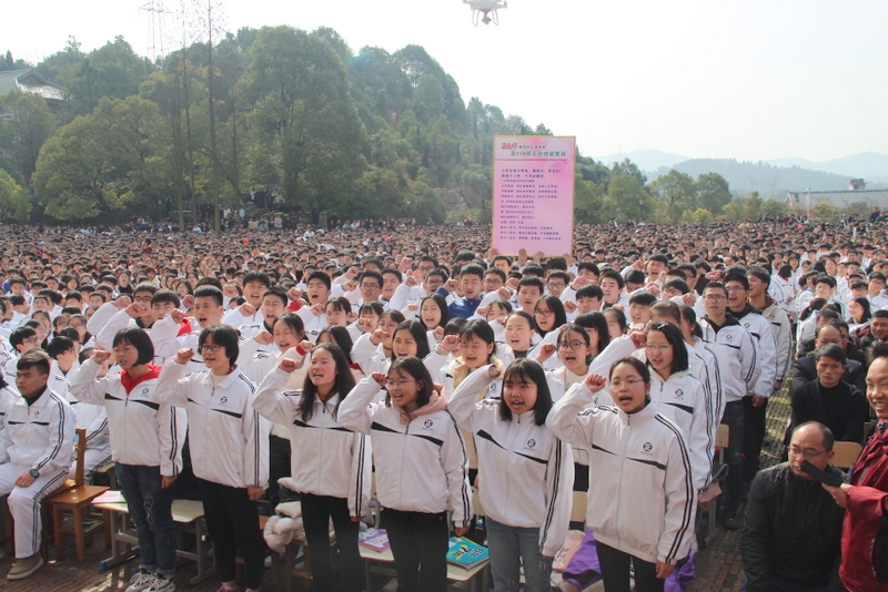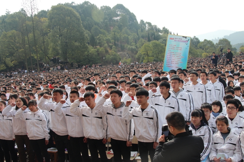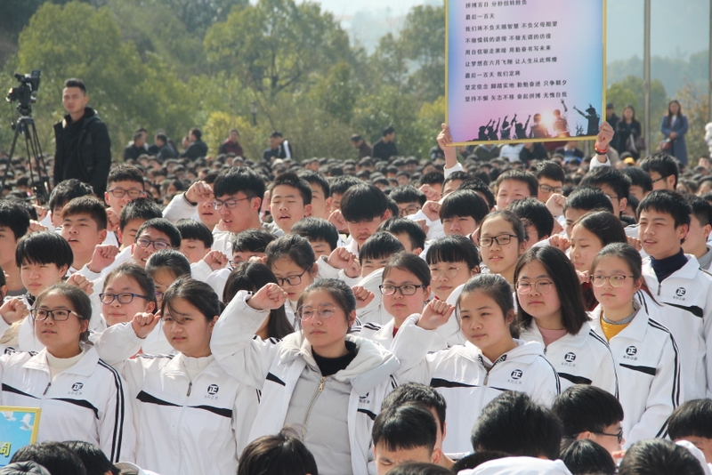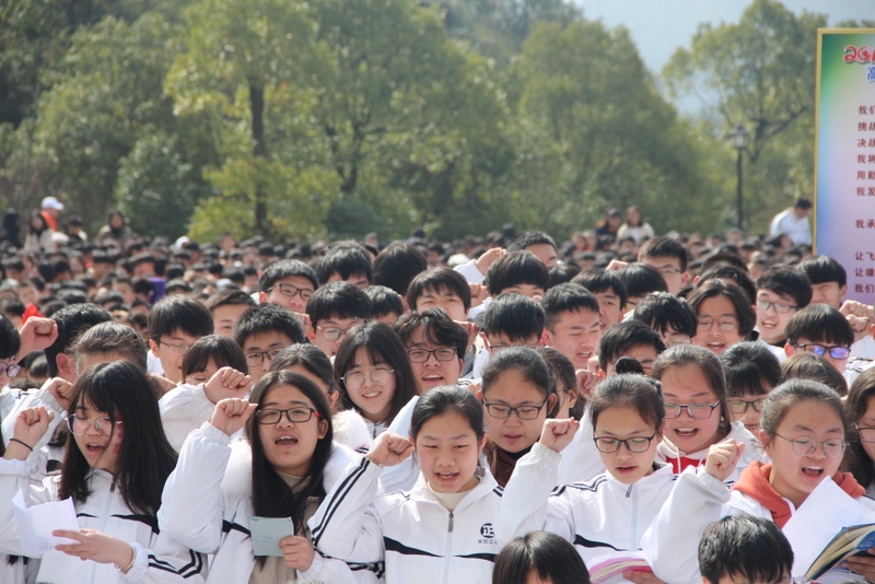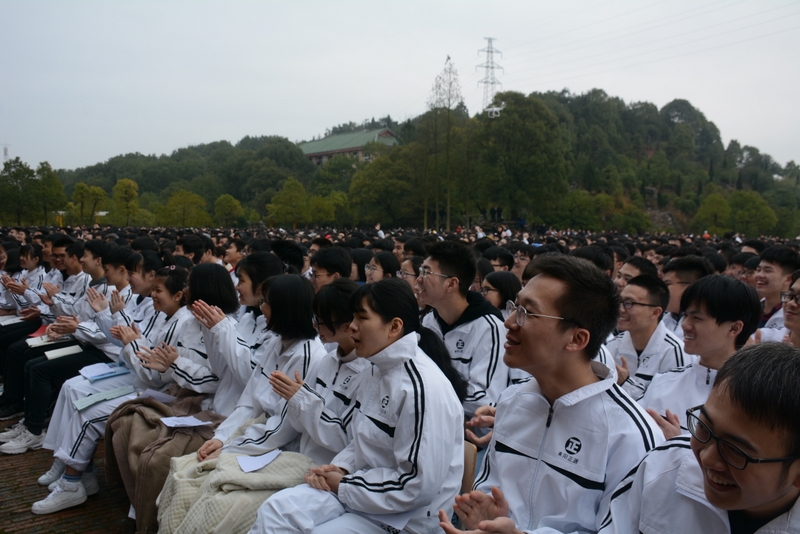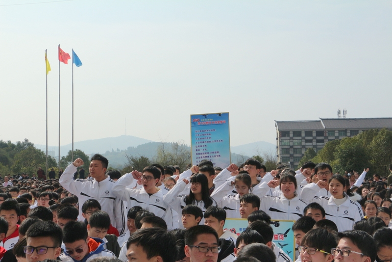 最后,全体高三学生起立,全场近两万名师生员工在大会主持人带领下,一起为高三学子呐喊助威: