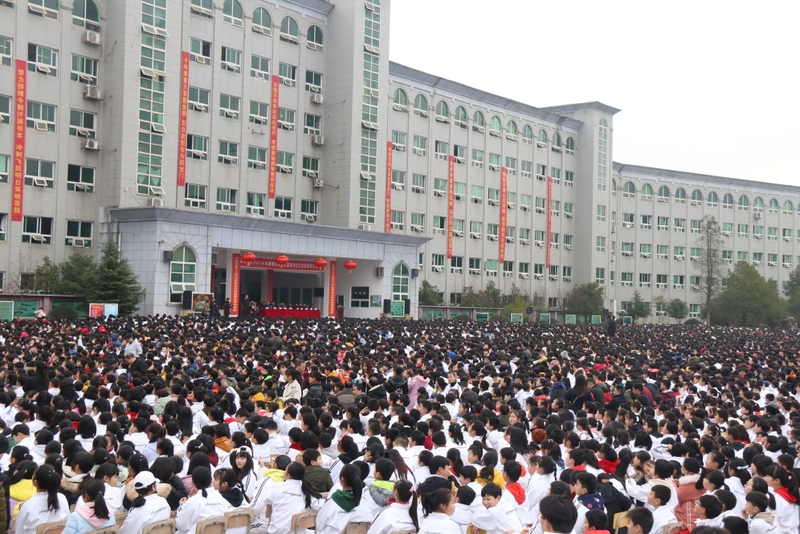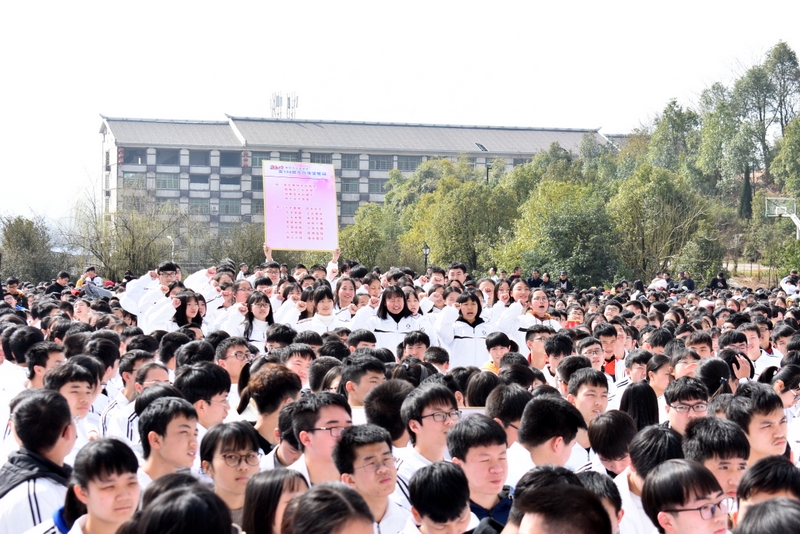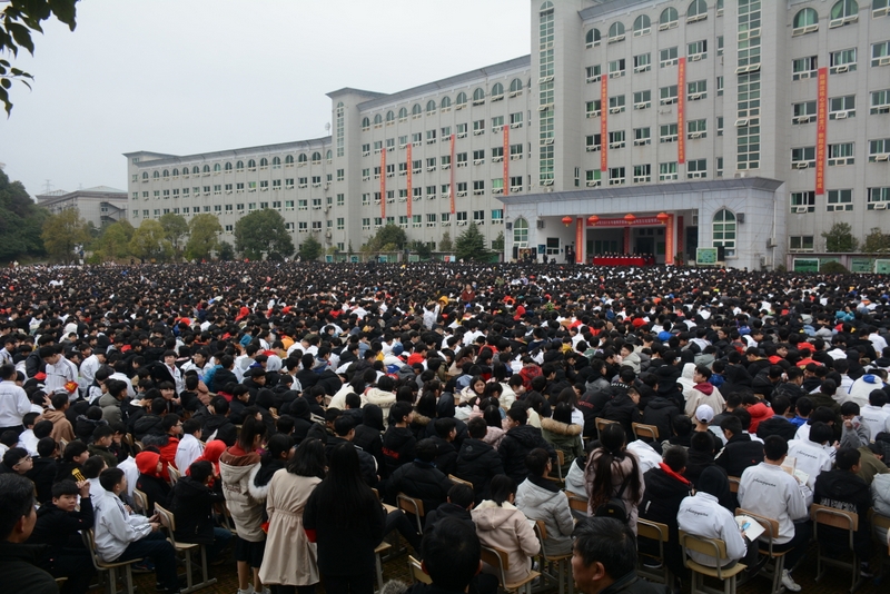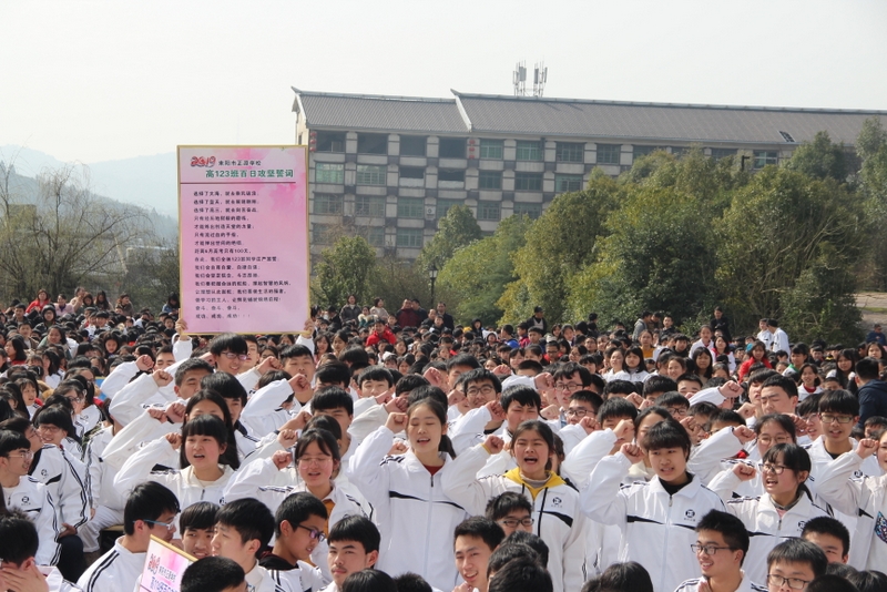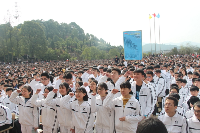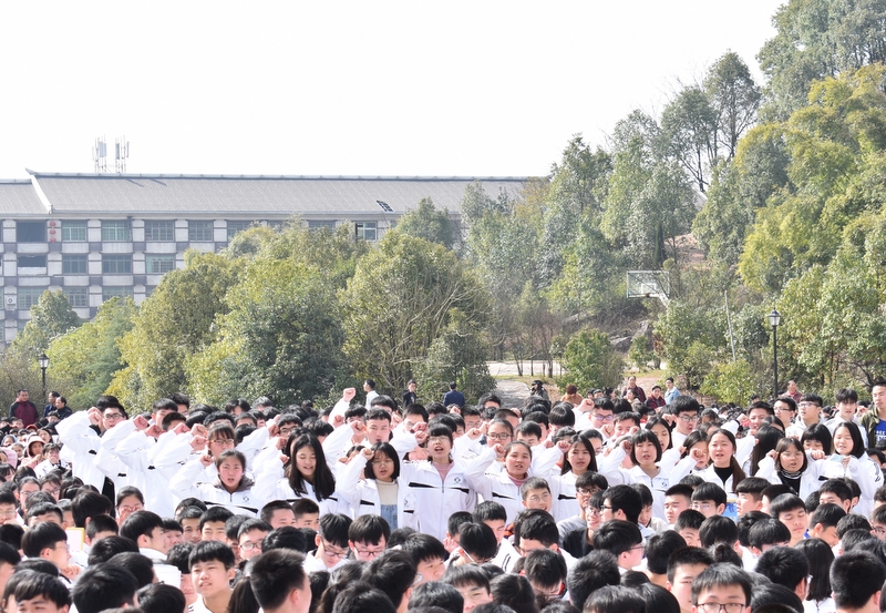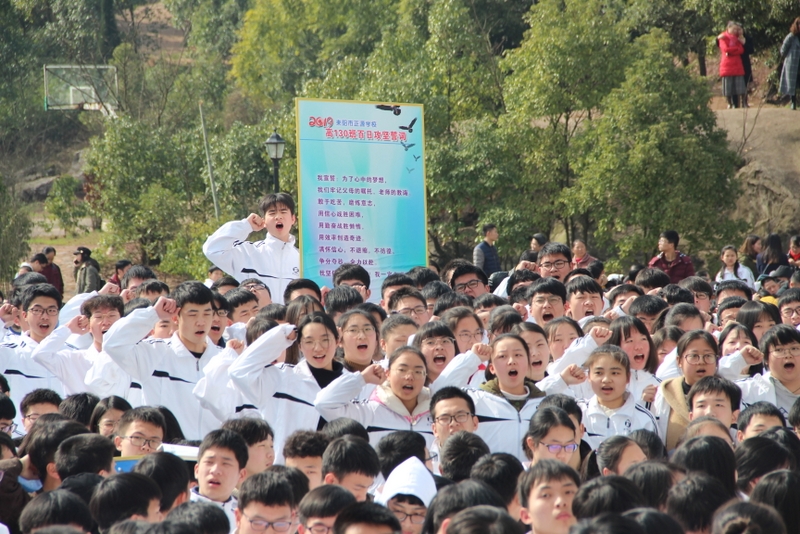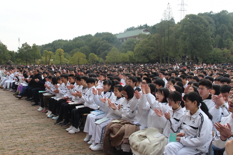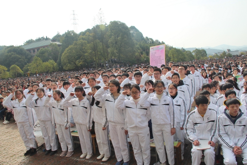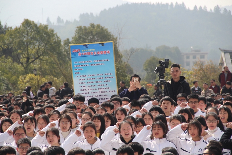最后,全体高三学生起立,全场近两万名师生员工在大会主持人带领下,一起为高三学子呐喊助威: