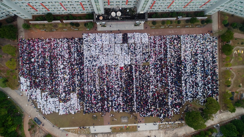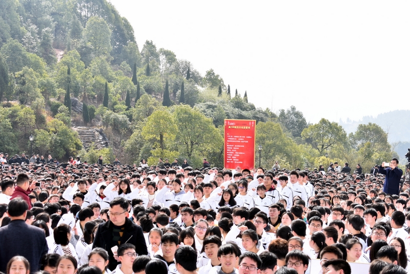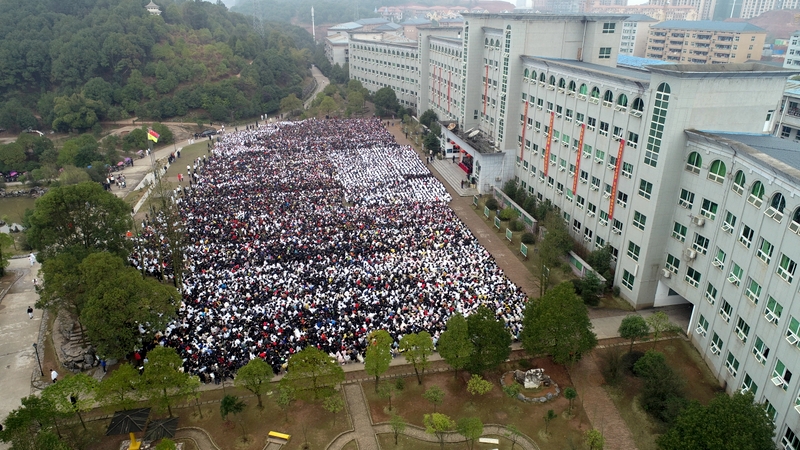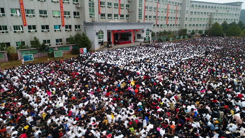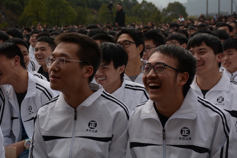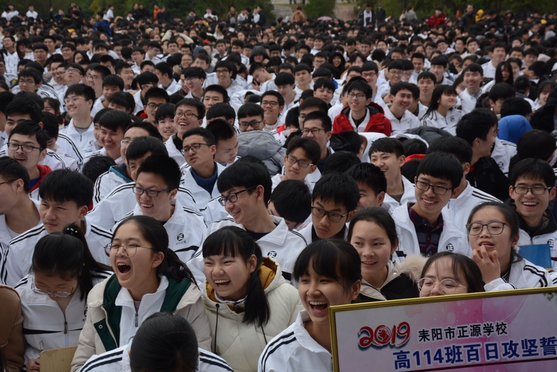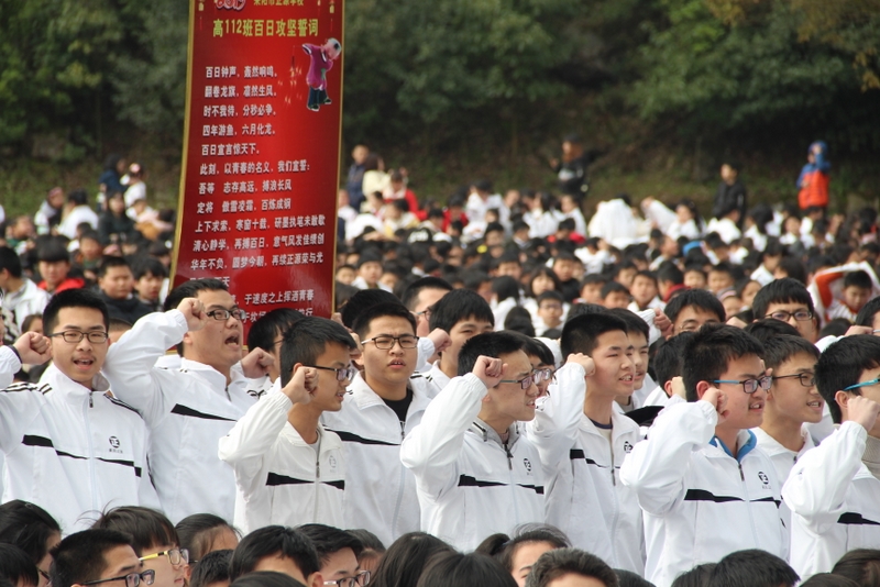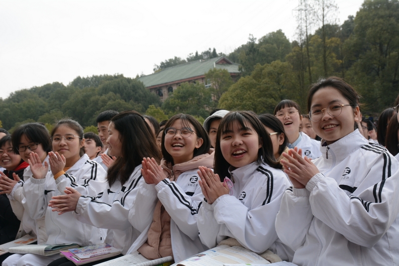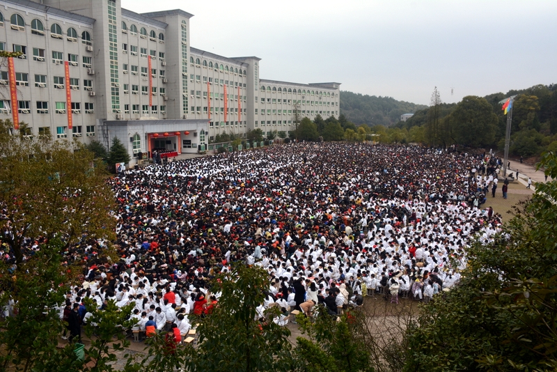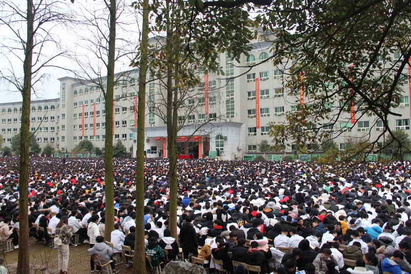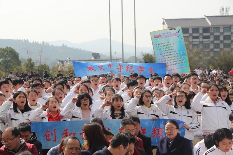 最后,全体高三学生起立,全场近两万名师生员工在大会主持人带领下,一起为高三学子呐喊助威: