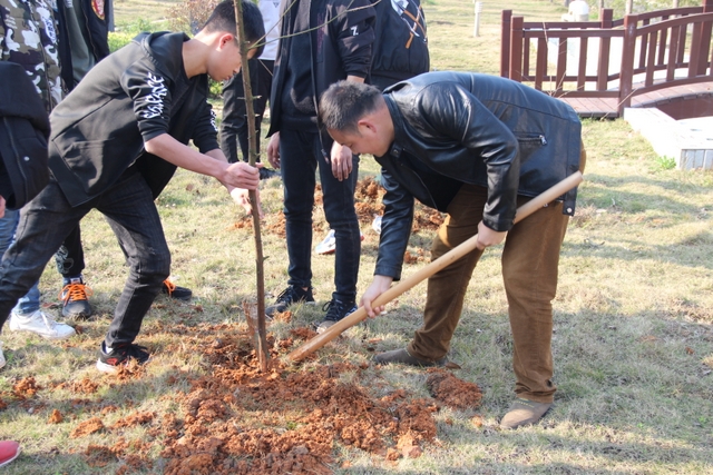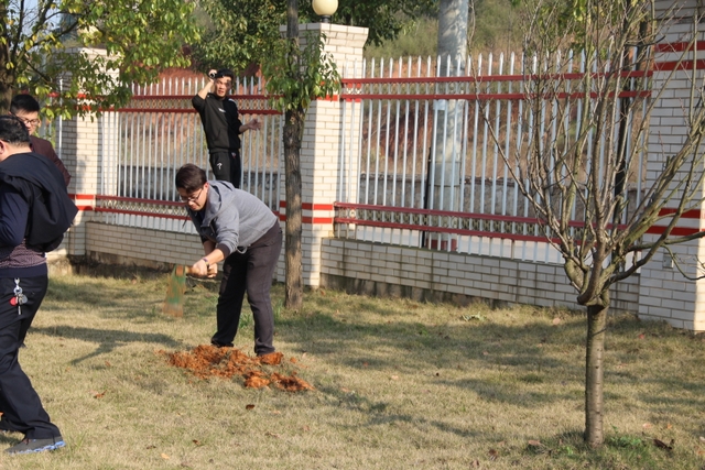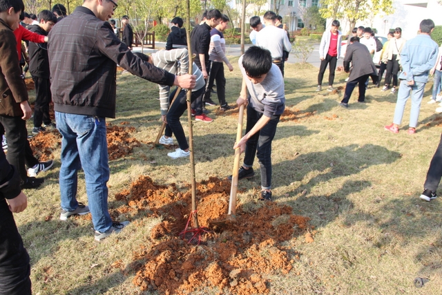 来到植树场地,大家兴致勃勃,争抢着掘地挖洞,有的同学甚至汗流浃背,累并快乐着。