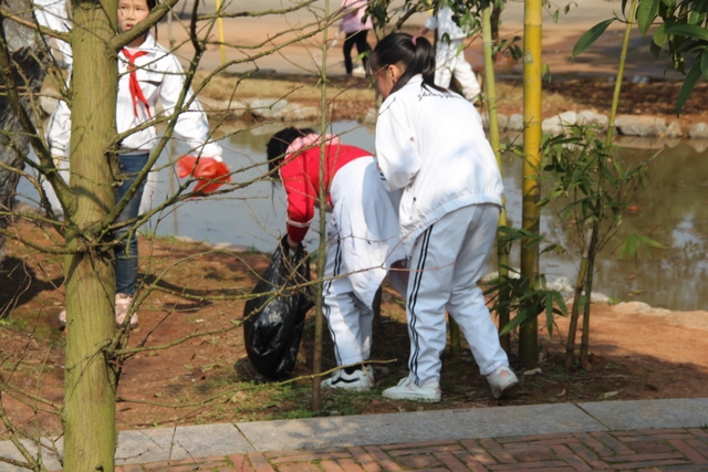 在老师们的带领下,“小雷锋”们分工合作,有的认真清理着小花园,有的拿着垃圾钳仔细的地清理着路边的垃圾,还有的清理着路边的公告栏。