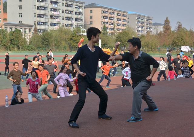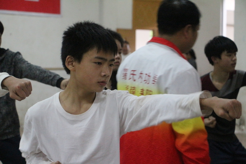 启动仪式上,同学们观看了《罗氏内家拳》视频,罗氏内家拳代表性传承人罗锡平总教练进行了一个多小时的现场教学。同学们兴趣盎然,一丝不苟,哈——哈——哈!喊声洪亮,用足了精、气、神;一招一式,在总教练和几位助理教练手把手地指导下,从疲软乏力,到刚健有力,从动作迟缓,到反应迅速、出手敏捷,进步很快,罗氏内家拳的特点已现端倪。