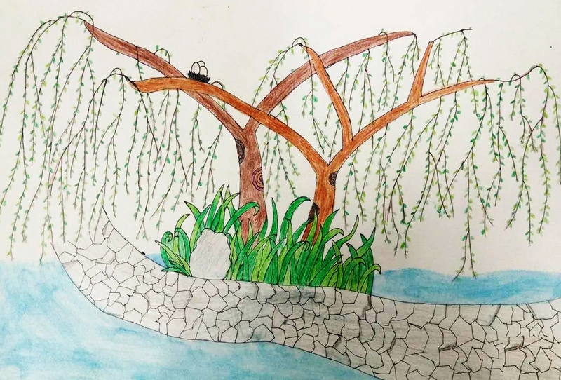 然后,我又向假山走去,看见岸边有着几棵柳树婀娜多姿、美丽动人,柳枝在春风的吹拂下,翩翩起舞,就像几位害羞的姑娘,坐在岸边梳理着那美丽的长发。