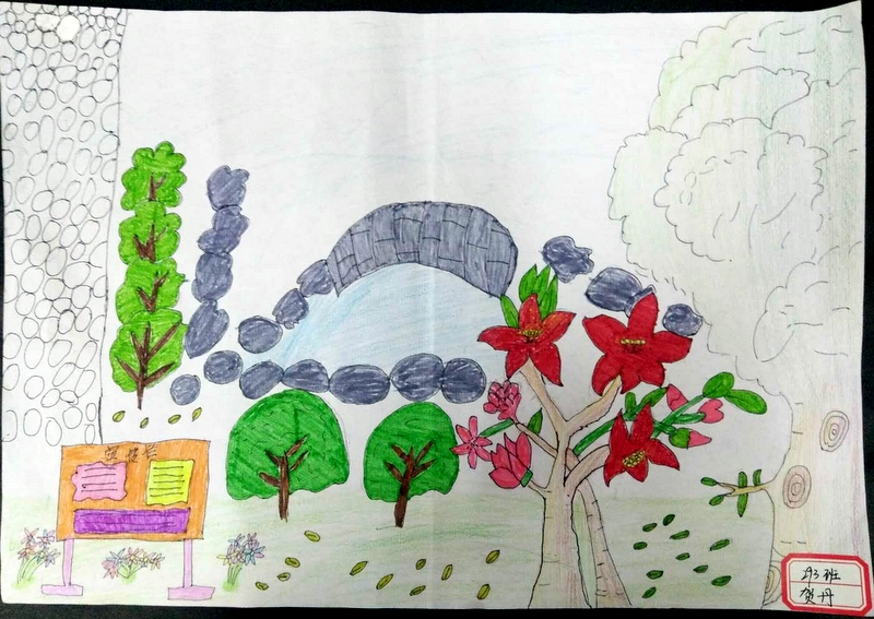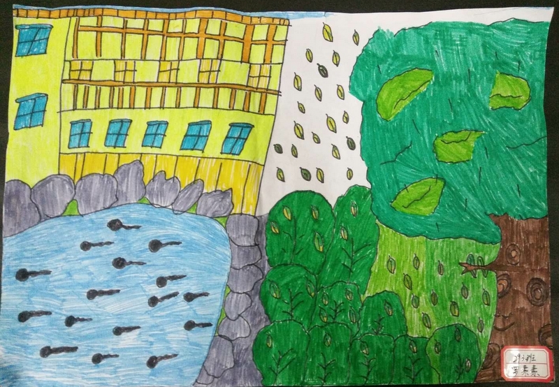 穿过操场,站在旗台上向南观望,只见池塘两边是各种花筑成的花墙,偶尔有小鸟在柳树头上蹦来跳去。来到池边,池水清澈,池中的小桥和拦水坝将小池从中间分为两半。北边小池的水从拱桥下流向南边小池,发出悦耳的声音,池面上涟漪阵阵,飘落的花瓣随波荡漾,一群群小鱼在花瓣间追逐嬉戏。不知是谁脱口而出:“哇,鱼戏鲜花间,鱼戏鲜花东,鱼戏鲜花西,鱼戏鲜花南,鱼戏鲜花北。”