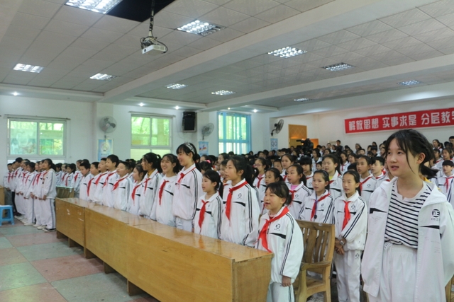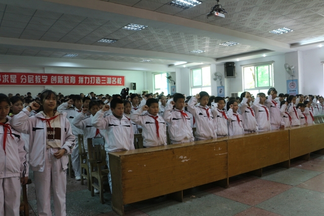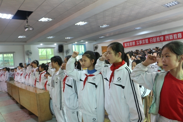 紧接着举行了庄严宣誓仪式。全体毕业生高唱队歌,高举右拳,在212班王雄飞同学带领下,向队旗宣誓: