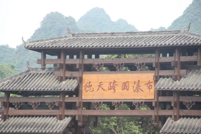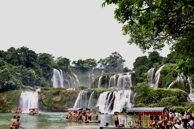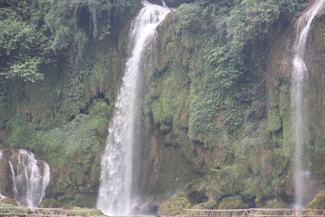 很快,德天瀑布就在前方,很远就听到了震聋欲耳的水流之声,响彻河谷。瀑布从崖上跌宕而下,分三级飞奔,撞击着层层岩石,水花四溅,迷雾朦胧……