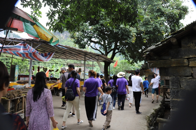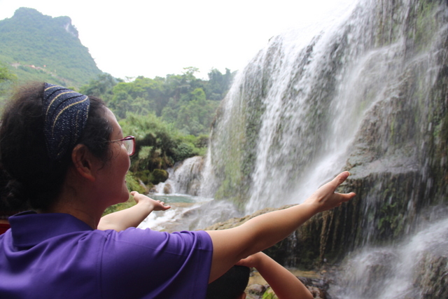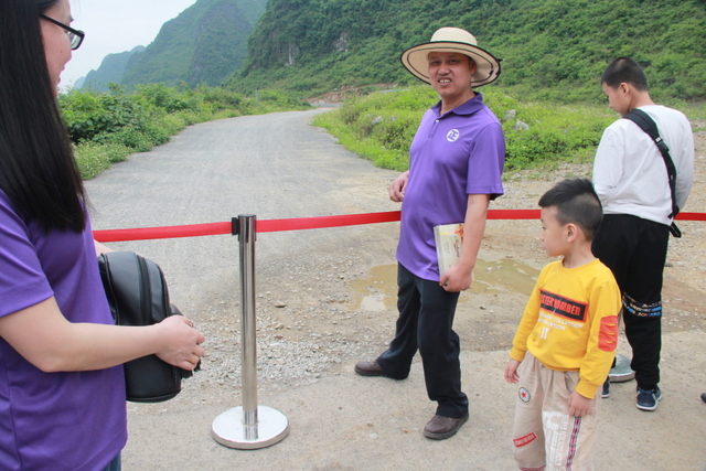 进入景区后,换乘景区环保车继续前行,沿中越界河向西,两岸山峰林立,对岸就是越南,越南一侧散落着零星的民居,风格与国内迥异,墙体颜色丰富,异域风情距我们仅一河之隔。车内年长的老师回忆起1979年的那场战争,彼时,越南一侧全是茅草屋,极其落后,如今,得益于中国旅游业的发展,不少越南边民划船到归春河对岸,兜售越南农产品、香烟、咖啡等,提高了经济收入。