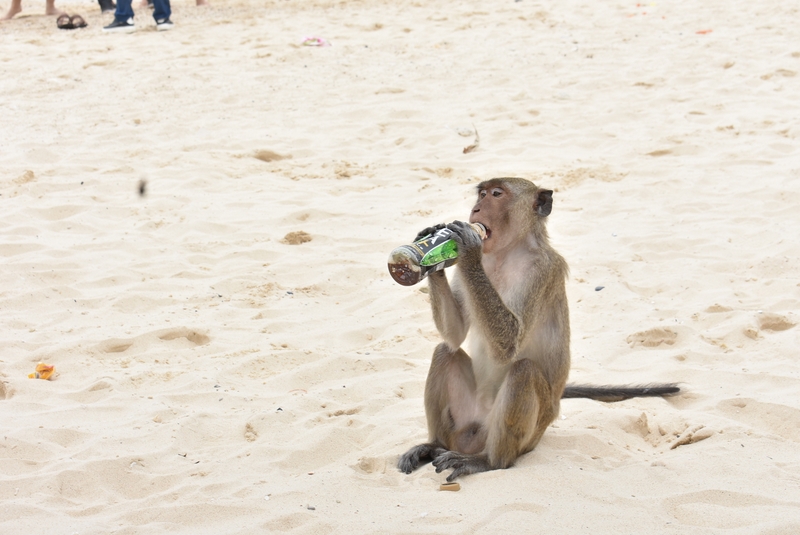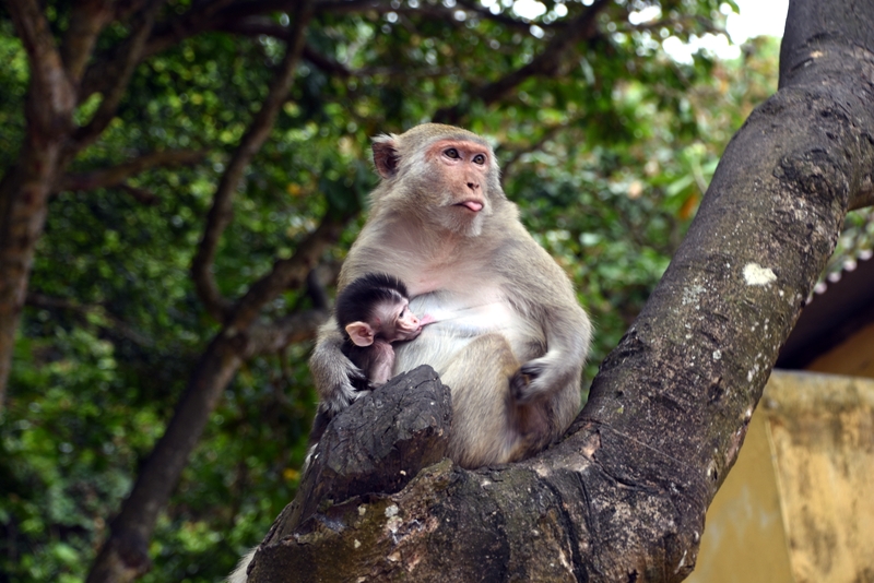 野生猴子也吸引了不少人的眼球。大大小小的猴儿们,个个野性十足,毫无畏惧,甚至从游客手里争抢食物,若有不从,武力攻击!笔者还发现,有几只猴子不屑于只在树林间跳上蹿下,而是以晾晒在屋檐下的两件床单为道具,看谁能在垂直的活动的平体物质上爬上去。一些猴子一跳到被单中间就抓不住,摔落下去。再来,再摔落下去。但他们毫不气馁,似乎兴趣更加浓厚。终于一个小猴子似乎掌握了诀窍,它斜着向上跳,前脚一登,马上回跃到了晾被单的绳上,成功了,屡试不爽。其他几只猴子,有的立马跟着学会,有的还是不得要领。