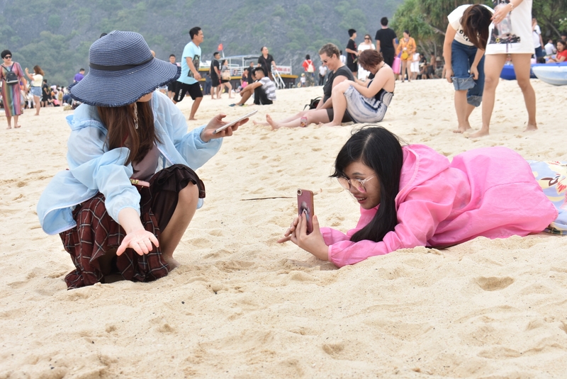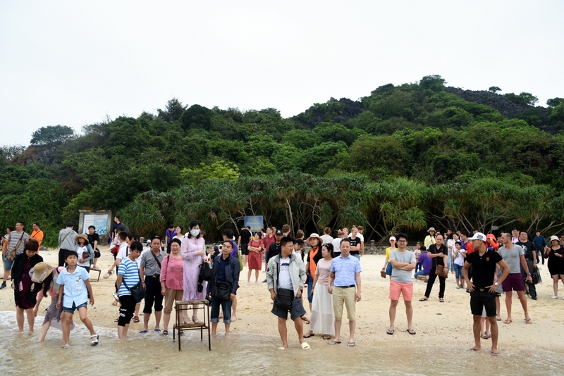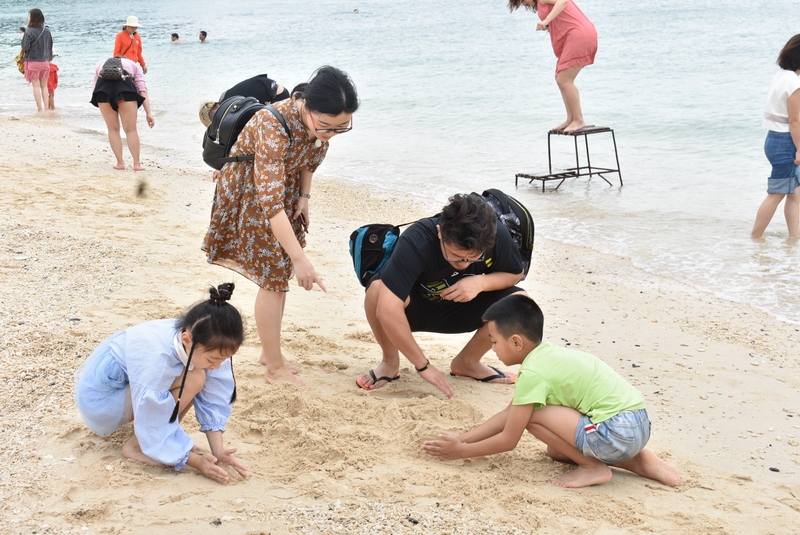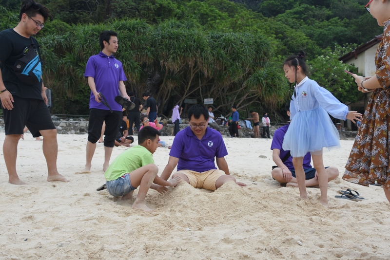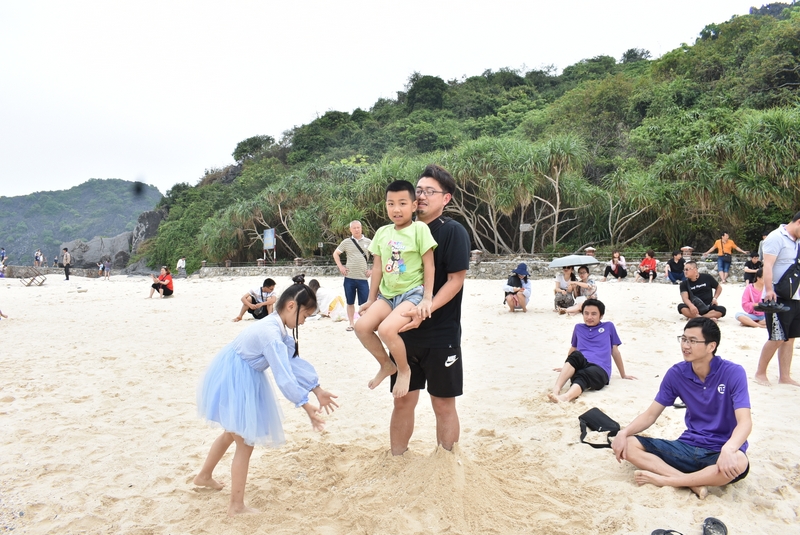 兰沙湾,是一片沙滩。船一靠近,老师们、小孩们迫不及待地跳下水里,感受海水的清凉和沙滩的绵软,三三两两,摆出各种造型,拍照,摄像、拍抖音,不亦乐乎。