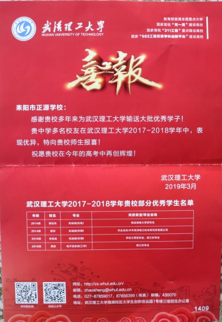 近日,学校收到武汉理工大学喜报,正源校友4名学生榜上有名。他们是:
