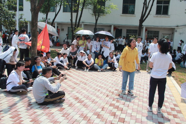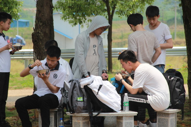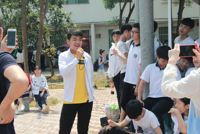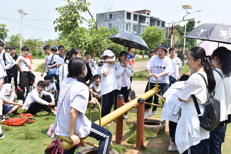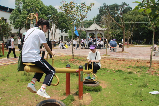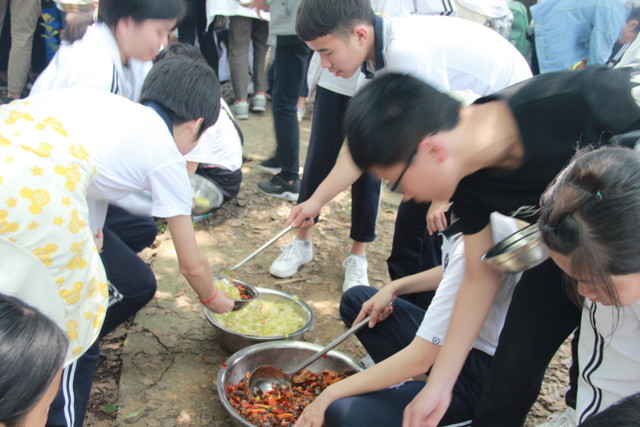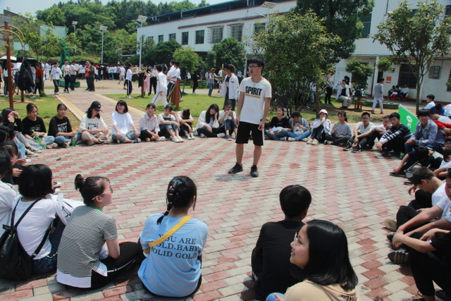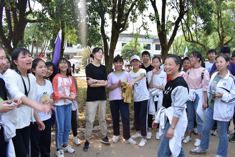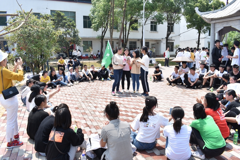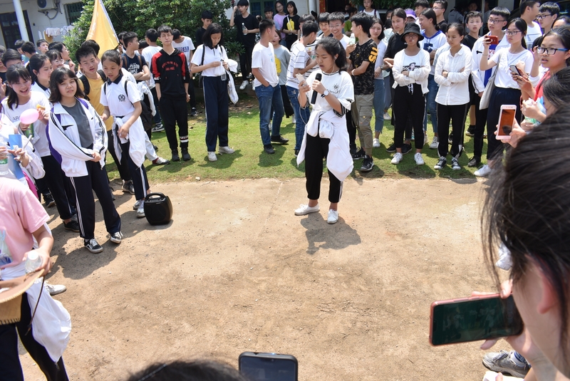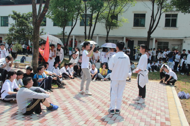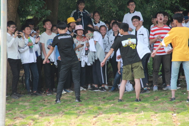 吃过午饭,照完班级集体照后,各班开始自行组织文娱活动。只见同学们围成一圈,挨个展示自己的才艺,或一展歌喉,或一展舞姿,每场show time结束后都会博得满堂喝彩。有的同学在广场娱乐区玩起了跷跷板,回味童年的味道;有的同学直接在广场的铁杆上做起了引体向上,展示健壮身躯;还有的同学三两成群的在篮球场上挥洒汗水,展现青春活力。各位老师也都是八仙过海,各显神通,罗经飞主任更是化成街头卖艺歌手,倾情为大家演唱了一首《我爱你中国》,收获了不少粉丝,同学们有钱的“捐钱”,有力的出力,为他们的“飞哥”喝彩。