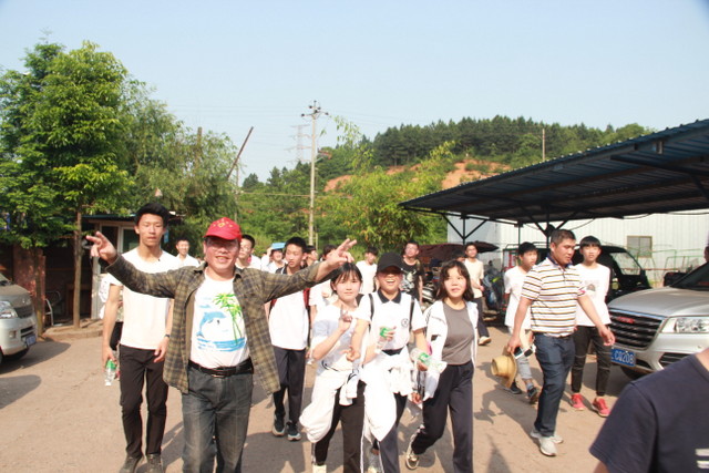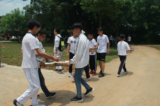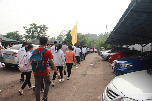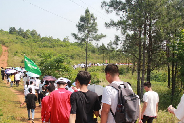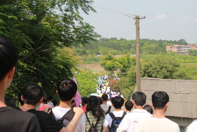 经过一段时间的跋涉后,太阳也早已不再和蔼可亲,开始变得毒辣起来。汗水在同学们脸上汇成小河,他们开始觉得腿部酸痛无力,有些同学的脚板上起了水泡,但同学们依然咬紧牙关,与毒辣的阳光、与不适的身体做斗争,在疼痛中磨炼自己的意志。