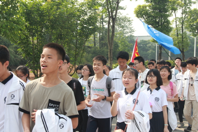 8时50分,在准高一年级钟琼佳主任的一声号令之下,1100余名准高一师生踏上征途。笔直的马路上出现一条气势磅礴的长龙,浩浩荡荡,势不可当。同学们个个精神饱满,斗志昂扬。一路上,五彩缤纷的班旗迎风飘扬;一路上,蓝天白云作伴,充满欢声笑语。行进路上,有一个班级格外引人注目,他们带着小型音响,悠扬悦耳的流行乐、激动人心的红歌顿时响彻在同学们的耳旁,他们情不自禁地跟唱了起来,一路的欢歌笑语引来了行人和车上乘客的注目,同学们也都回以一个灿烂的笑容。