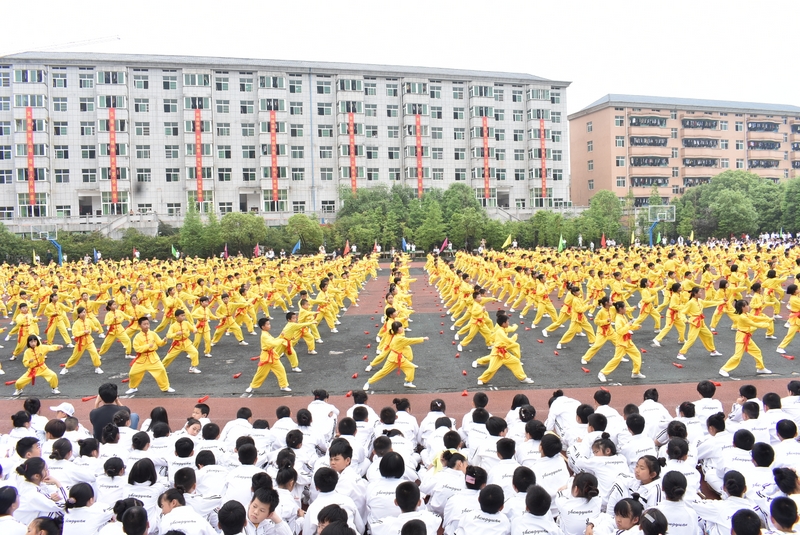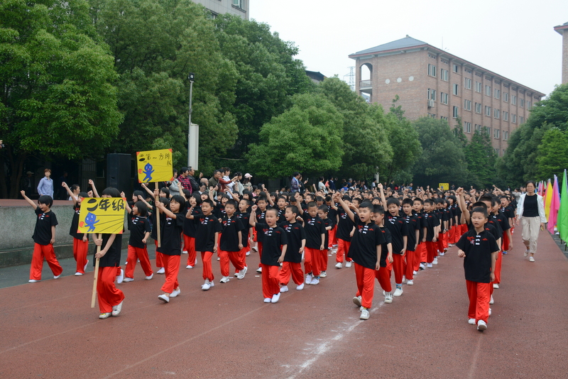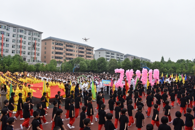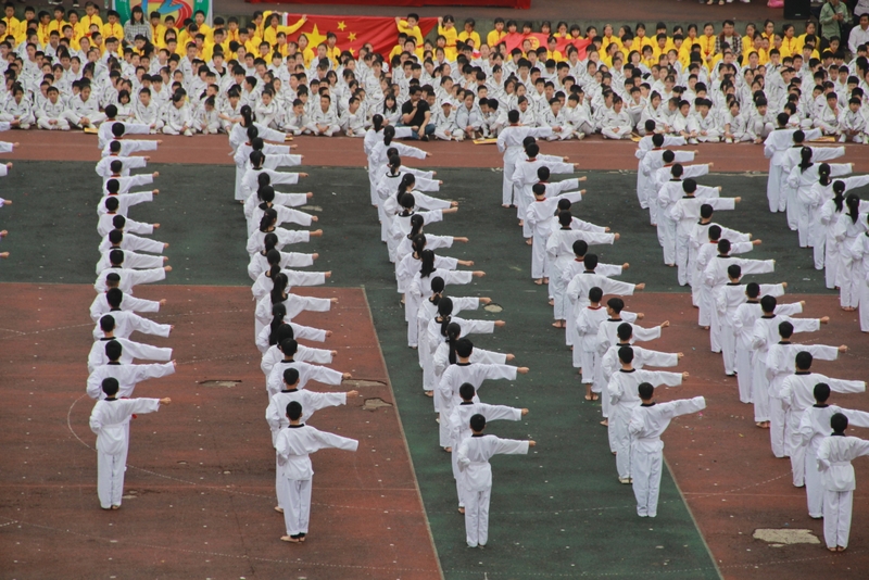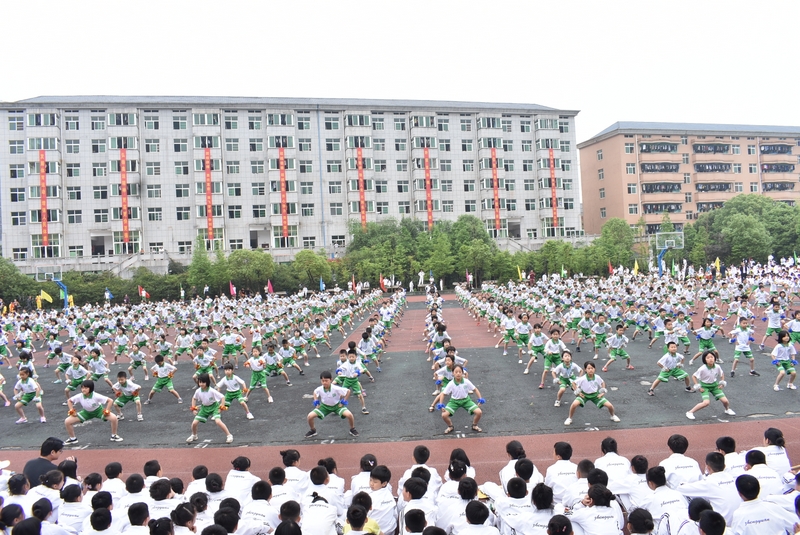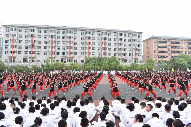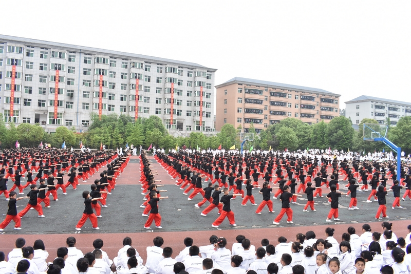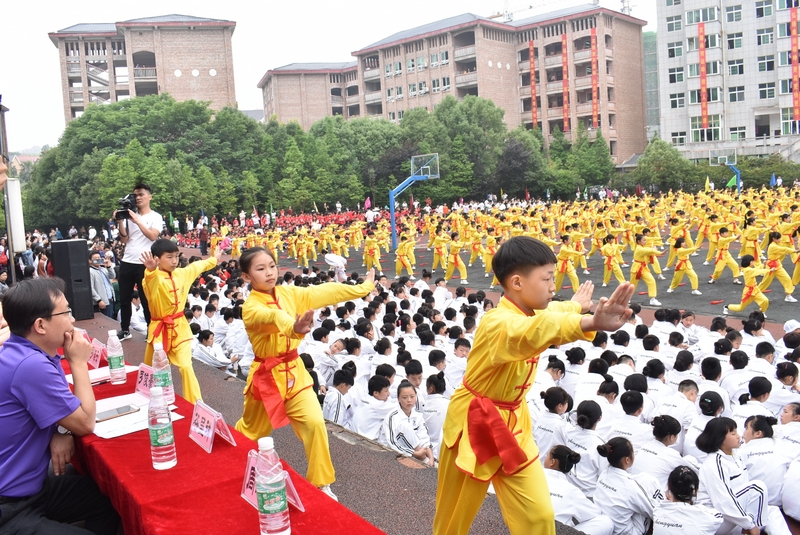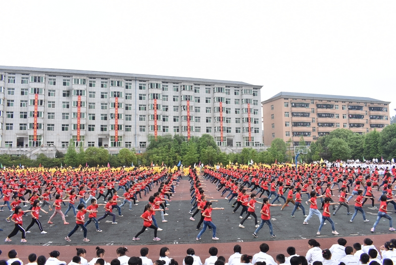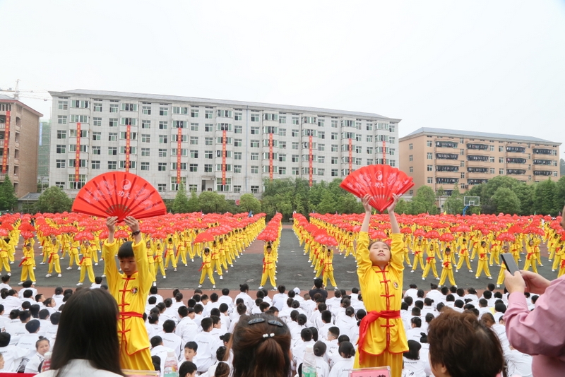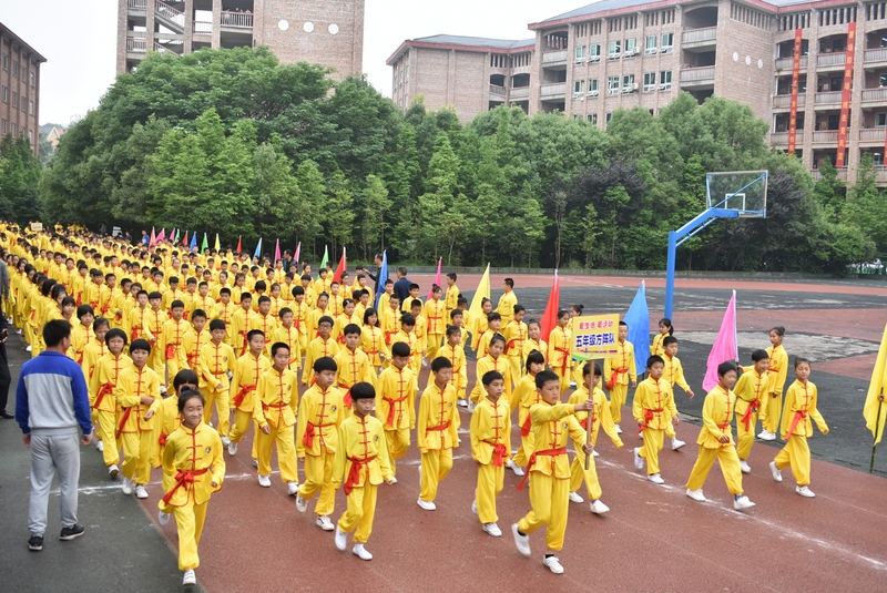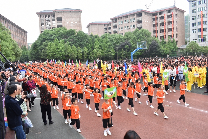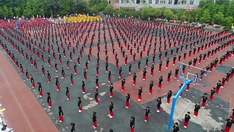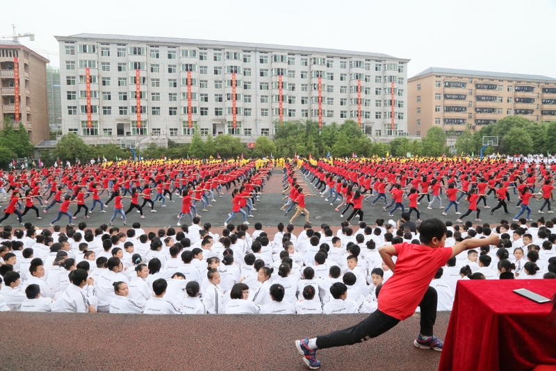 二年级833名同学表演《三字经》动作秀,一边做着各种武术动作,一边背诵“三字经”,文武并举,珠联璧合。