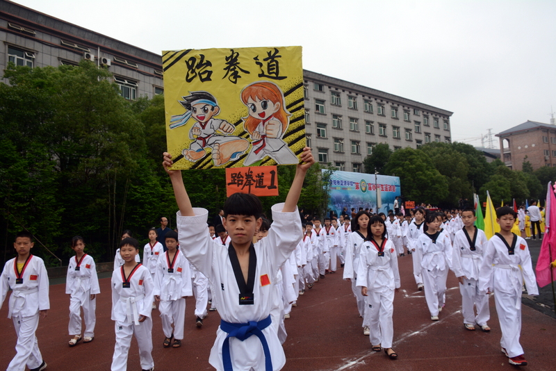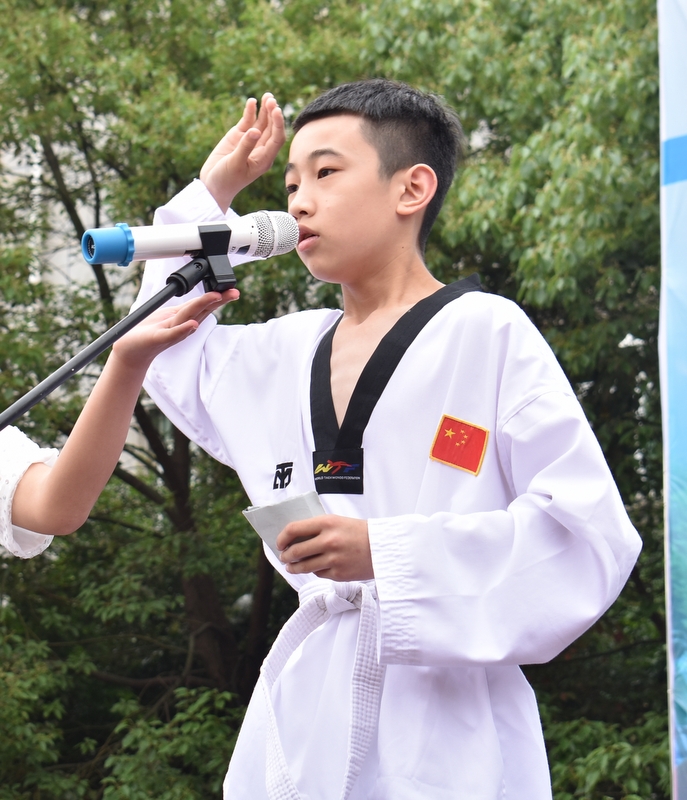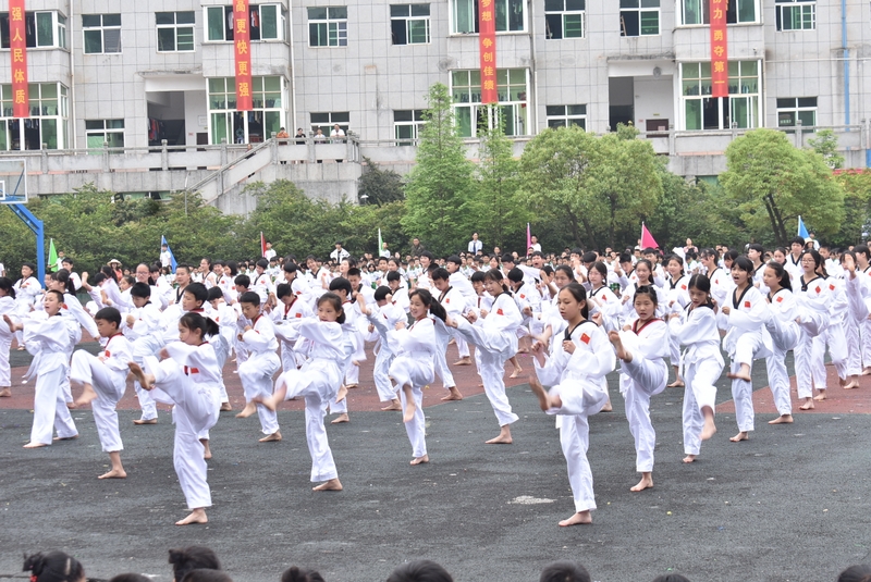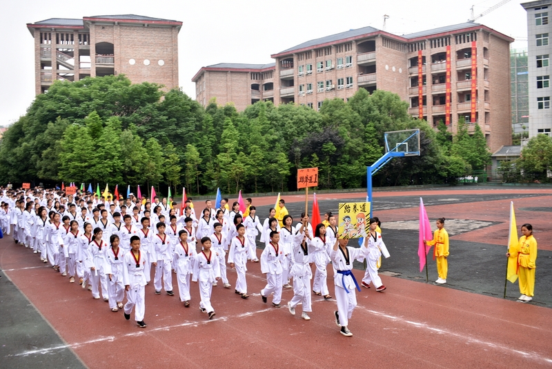 这群身着白色武术套服、腰扎白带的娃娃是谁?人体如此柔韧,大脑反应如此灵敏,出手如此迅猛,腿脚如此灵活……原来,他们是六年级424名同学在进行跆拳道表演。