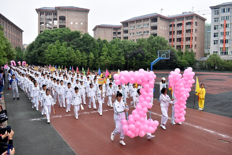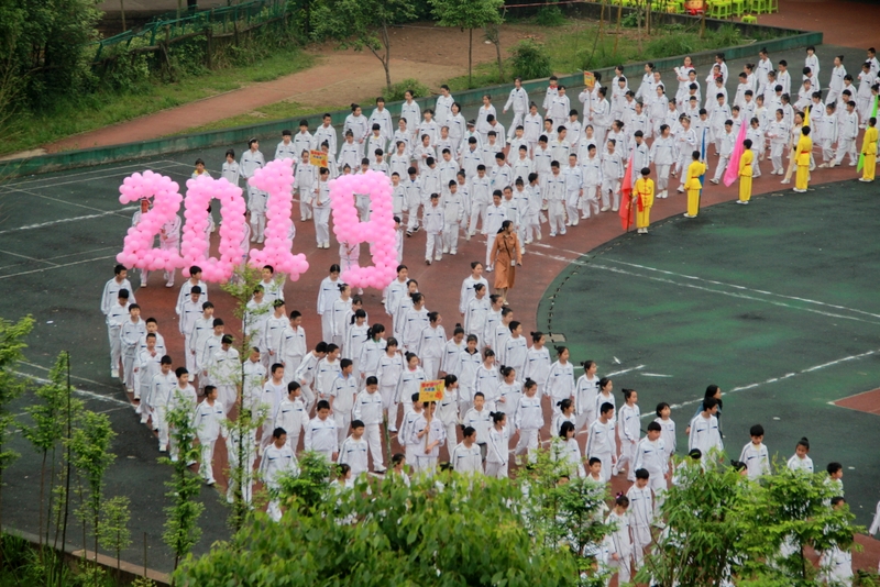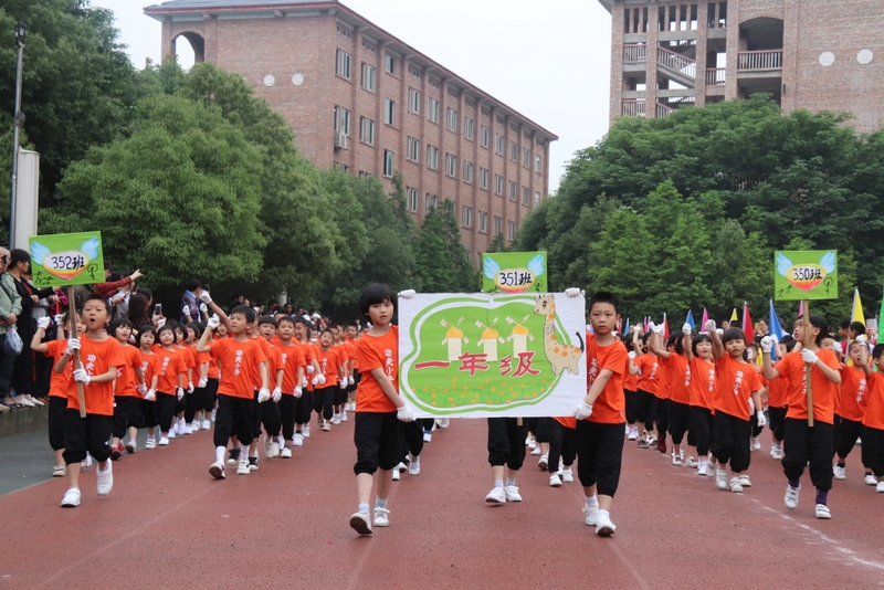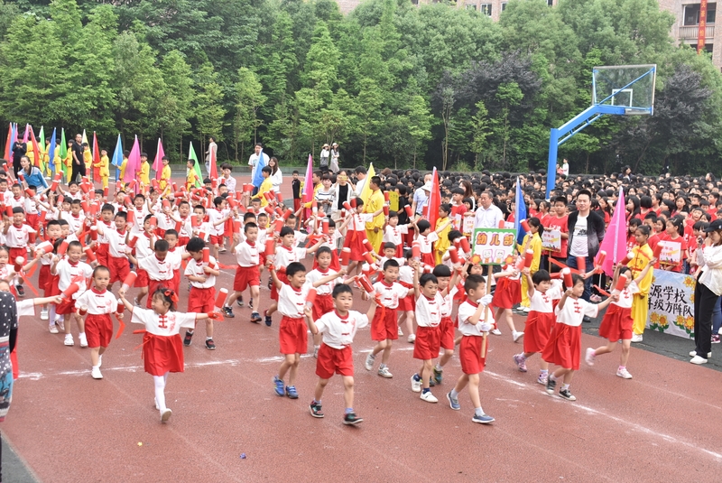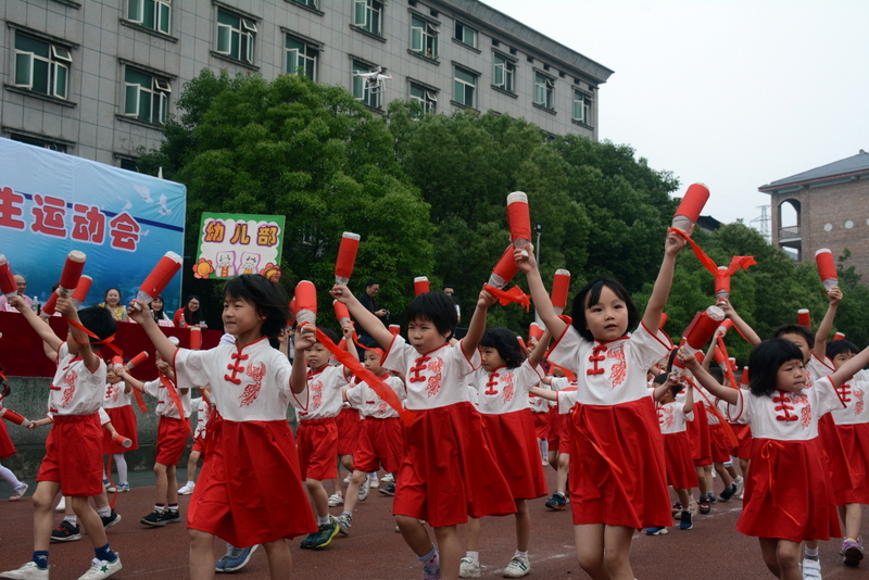 通学部方阵“ZY 2019”的粉红色气球造型特别醒目;四年级深红短袖上装上“全正源 最可爱”最能吸引眼球;三年级的方阵分别命名为花之队、蝶之队、梦之队,同学手腕上的各色花环熠熠生辉;一年级的队牌上画着长着翅膀的天使,别看他们个头小,可是从着装上看,个个都是“功夫小子”;最后出场的是幼儿园的小朋友,他们手中的道具简直是异想天开,几乎不需要花一分钱,居然是纯净水瓶内面装上砂子,外面用红纸隐藏起庐山真面目,小豆豆们摇动起来银铃般作响……