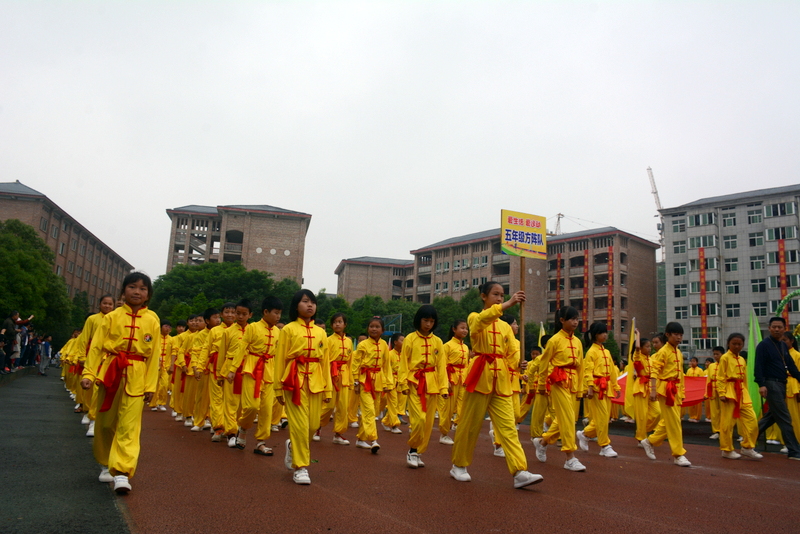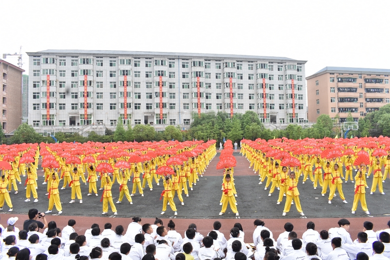 五年级918名同学,身着黄色武术服,腰扎红丝带,手执太极功夫扇,为我们带来了精武武术操《中国功夫》。