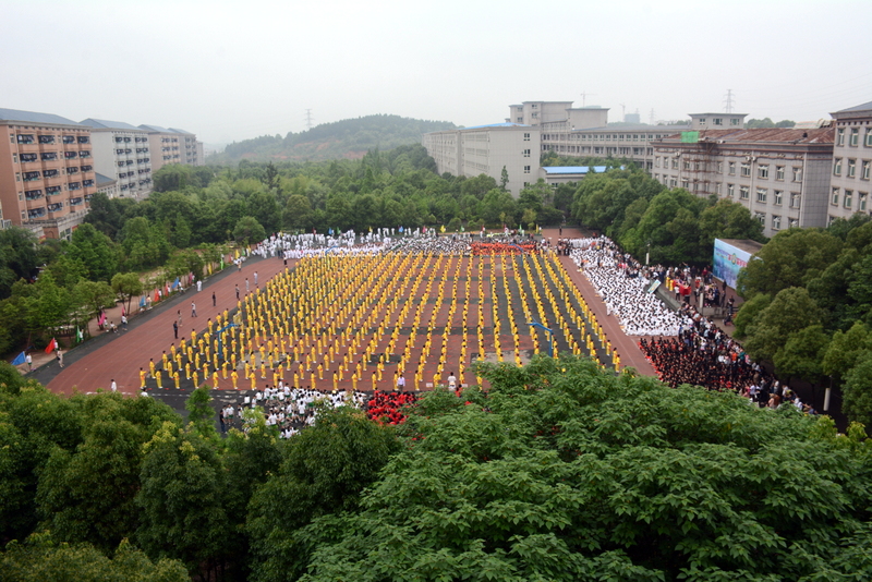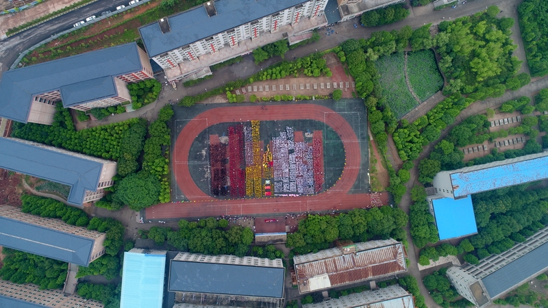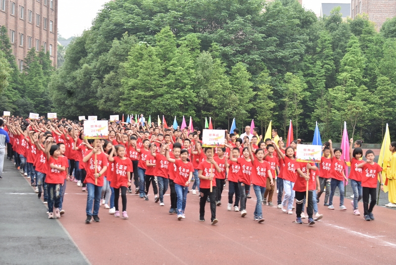 各年级每三个班组成一个方阵,身着不同的统一着装,举着彩绘各异的队牌,高呼各具特色的口号,英姿飒爽,气贯长虹。