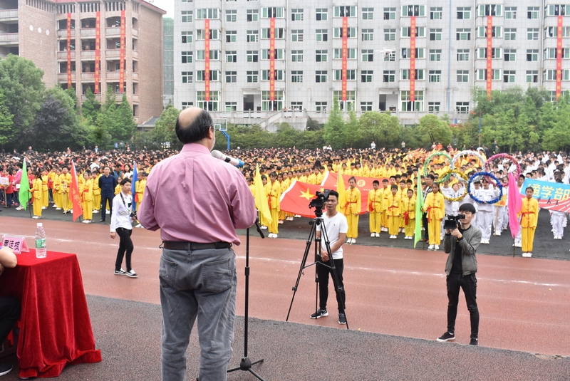 全场5000多人奏唱《国歌》之后,罗校长发表热情洋溢、催人奋进的致辞。他说:今天,山水相依、树木葱茏的青麓山又沸腾起来了。看到同学们兴高采烈、精神抖擞跨进运动场,校长也兴奋得无比自豪!