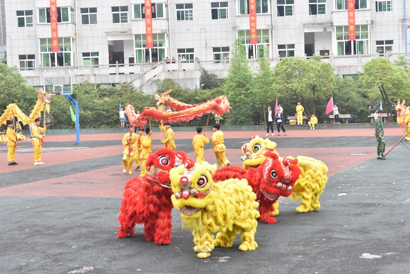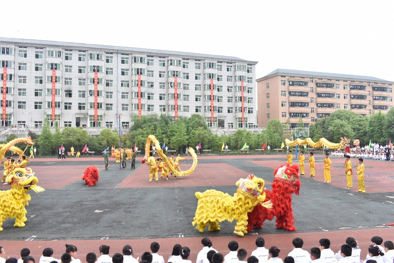 龙狮方队率先亮相。威风锣鼓声中,两头金狮、两头红狮,时而坐头,时而站腿,时而踩背,时而爪目相向,时而亲昵有加。逞威时,一头雄狮爬上四五米高的铁杆,摇头,摆尾,眨眼睛,末了吐出一条长长的红舌,原来上面还有四个金光闪闪的大字:敢打敢拼!下面两头狮子相呼应,吐出一副对联:龙腾正源舞耒水;狮震青麓搏潇湘。五条巨龙在广场上翻江倒海,掀涛作浪,搅得周天激烈。