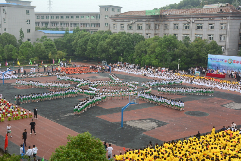红红的中国结,一闪一闪像蝴蝶;美美的中国结,红红火火多喜悦,你像一只只会说话的花喜鹊……通学部五六年级表演的队列变形《中国结》压轴。只见851名同学的庞大队伍,均分着从运动场的四角走进中央。他们每人手里拿着一把变色灯笼扇,时而变成黄色,时而变成红色,时而变成蓝色。队形也在不断的变化,有时成了奥运五环与S跑道,有时成了正源学校校徽"正"字与圆圈(谐音“源”字),最后变成“ZY 2019”。这变化,与广播里播放的歌曲《我相信》相得益彰,引人入胜。