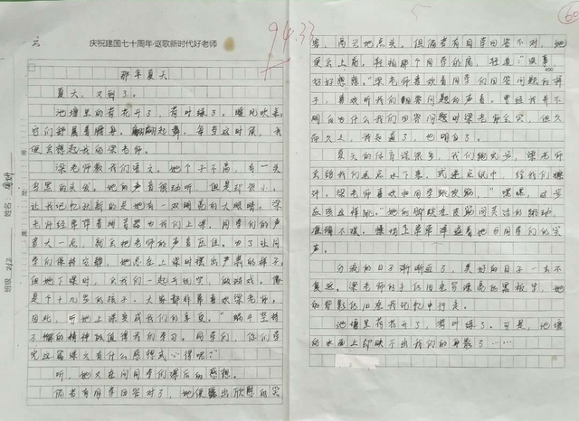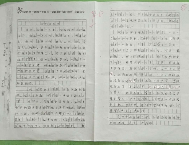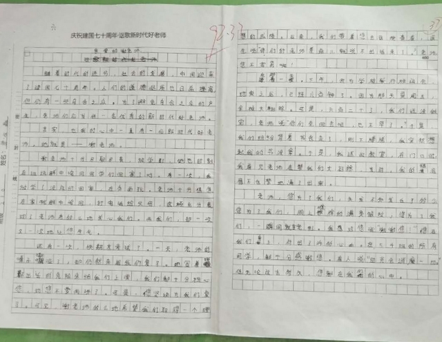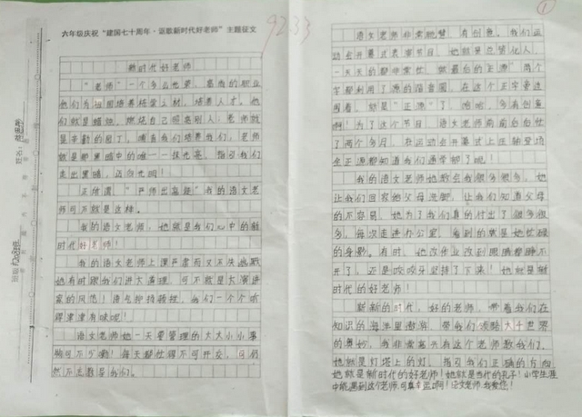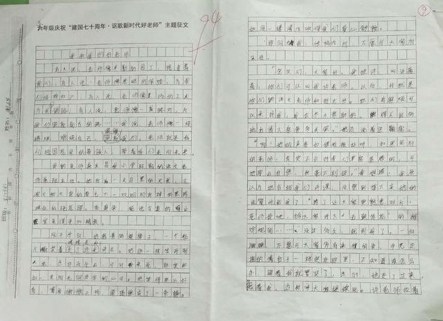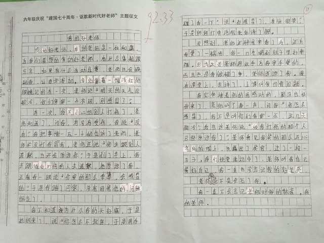 为大力提倡立德树人,弘扬和践行社会主义核心价值观,继承传统文化、开展传统文化教育、提高文化自信,践行与贯彻习近平总书记提出的“四有好老师”即“理想信念”“道德情操”“扎实学识”“仁爱之心”的时代理念,5月17日中午,小学通学部五六年级举行了“庆祝国庆七十周年,讴歌新时代好老师”征文比赛活动。