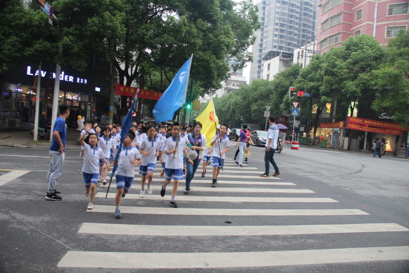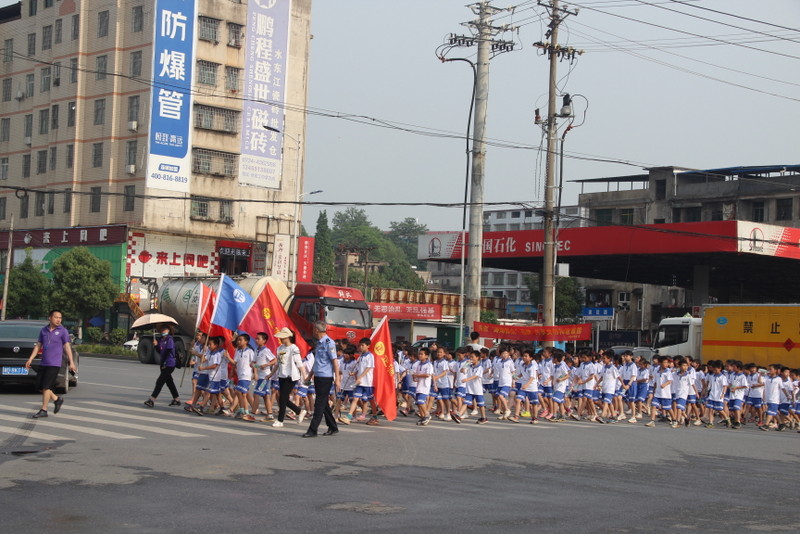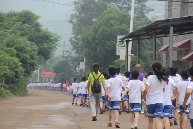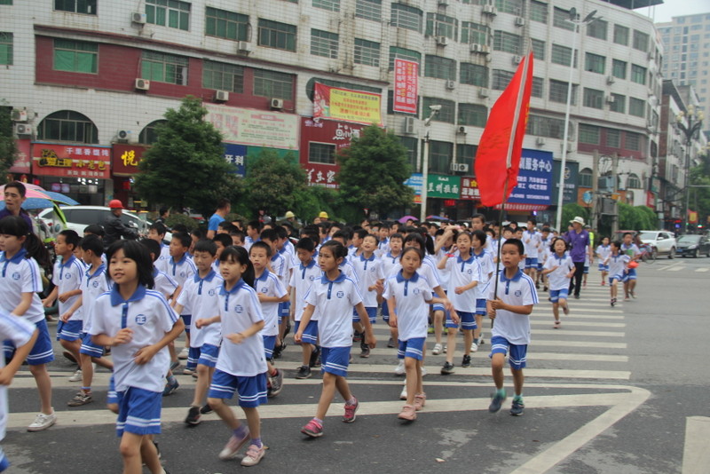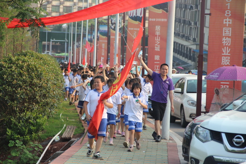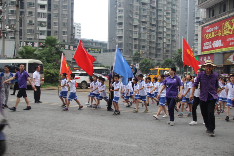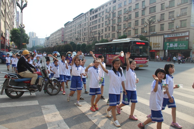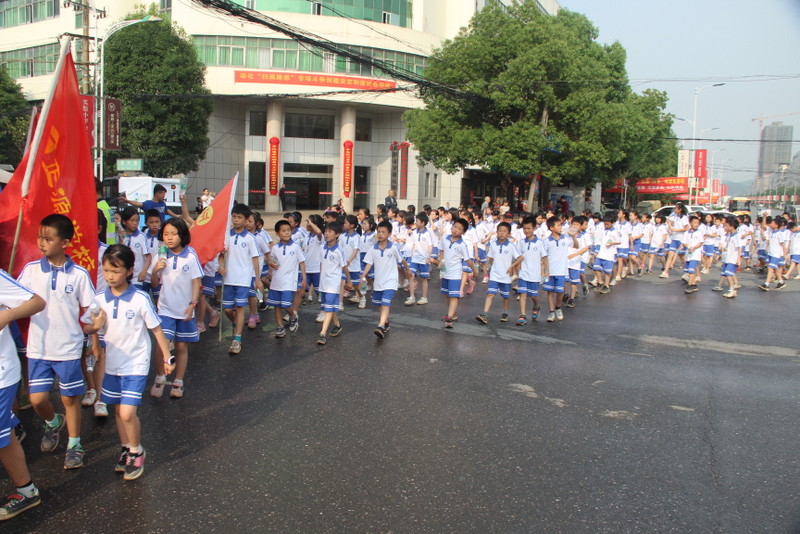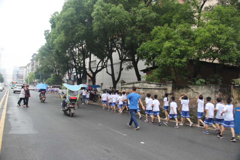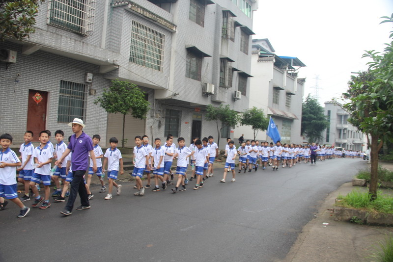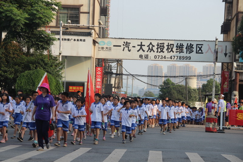 早上8:00,孩子们穿着崭新的白色校服,在运动场列队,聆听小学部主任罗俊豪讲话。罗主任不厌其烦地告诫孩子们行进途中要注意安全,高高兴兴去,开开心心回。同时希望孩子们发扬罗校长“进校即思进取,怕苦莫来正源”的顽强拼搏、吃苦耐劳、坚持不懈、锲而不舍之精神,徒步走完全程,绝不当“逃兵”。随后,罗主任一声令下,四年级全体师生在领队刘龙军主任的带领下,从学校西大门鱼贯而出,一条白色长龙在耒阳的大街小巷盘旋飞舞。