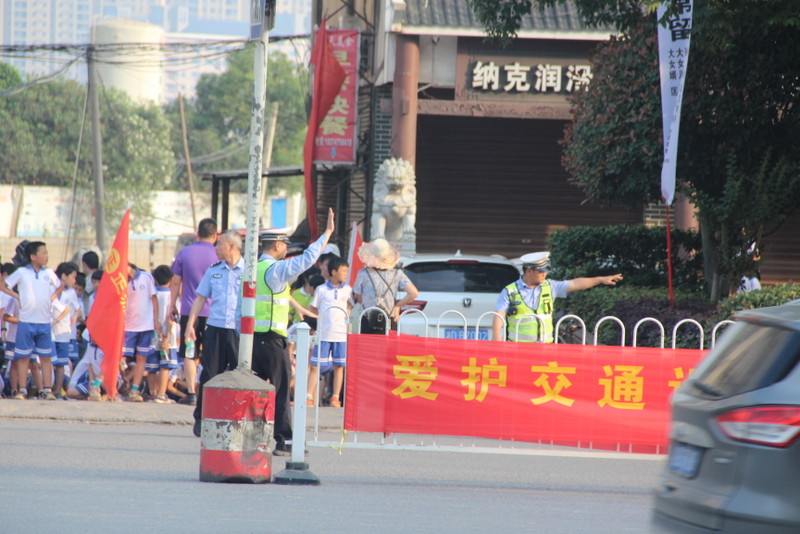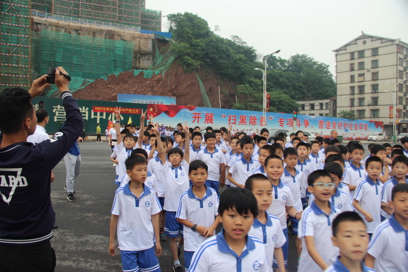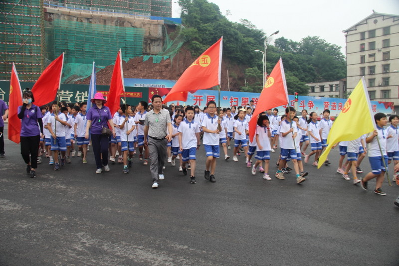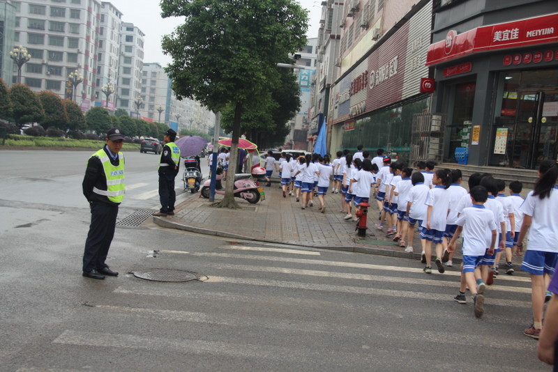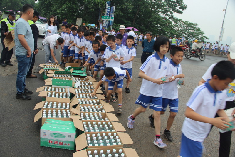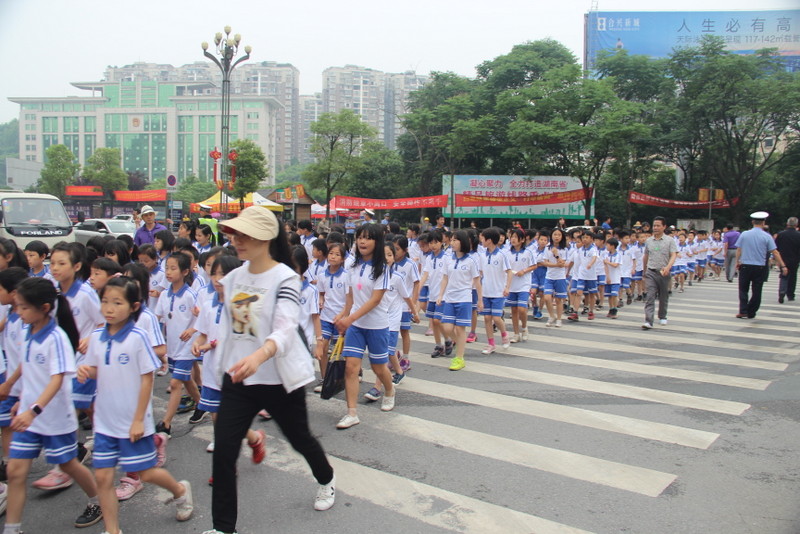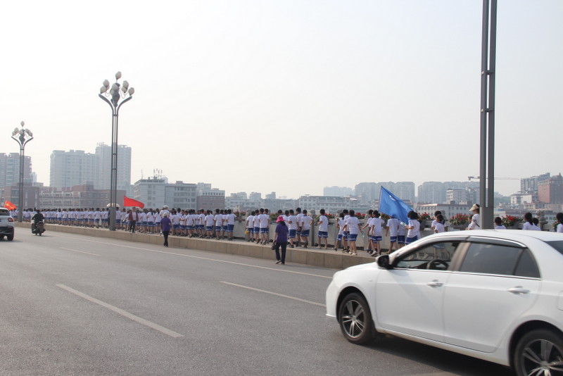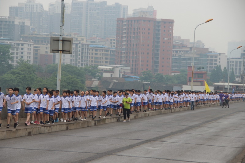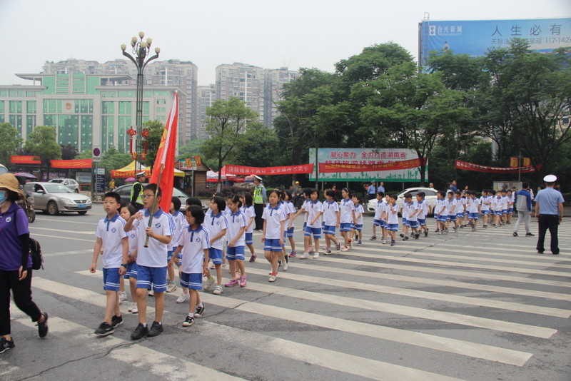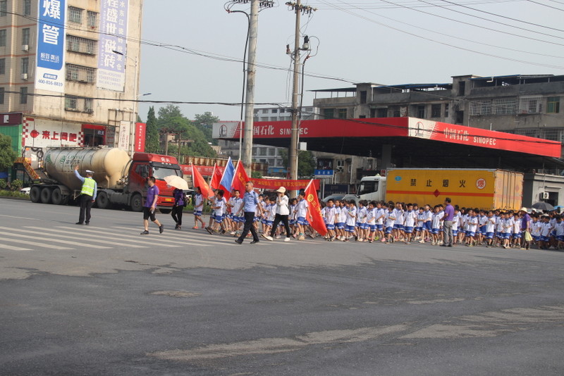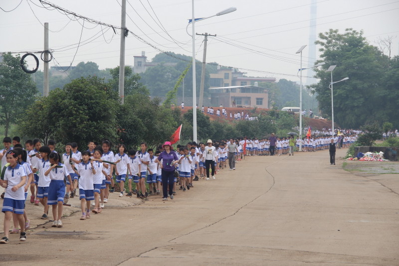 早上8:00,孩子们穿着崭新的白色校服,在运动场列队,聆听小学部主任罗俊豪讲话。罗主任不厌其烦地告诫孩子们行进途中要注意安全,高高兴兴去,开开心心回。同时希望孩子们发扬罗校长“进校即思进取,怕苦莫来正源”的顽强拼搏、吃苦耐劳、坚持不懈、锲而不舍之精神,徒步走完全程,绝不当“逃兵”。随后,罗主任一声令下,四年级全体师生在领队刘龙军主任的带领下,从学校西大门鱼贯而出,一条白色长龙在耒阳的大街小巷盘旋飞舞。