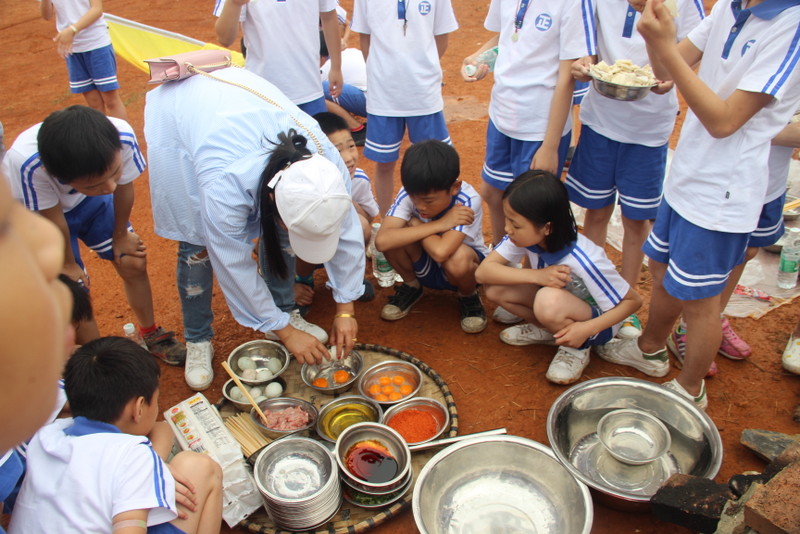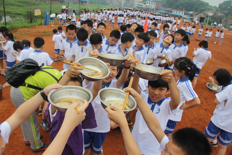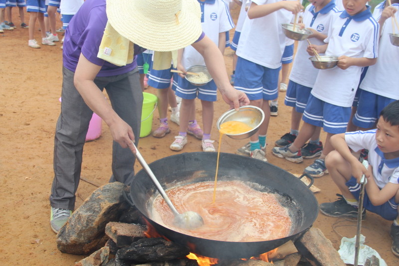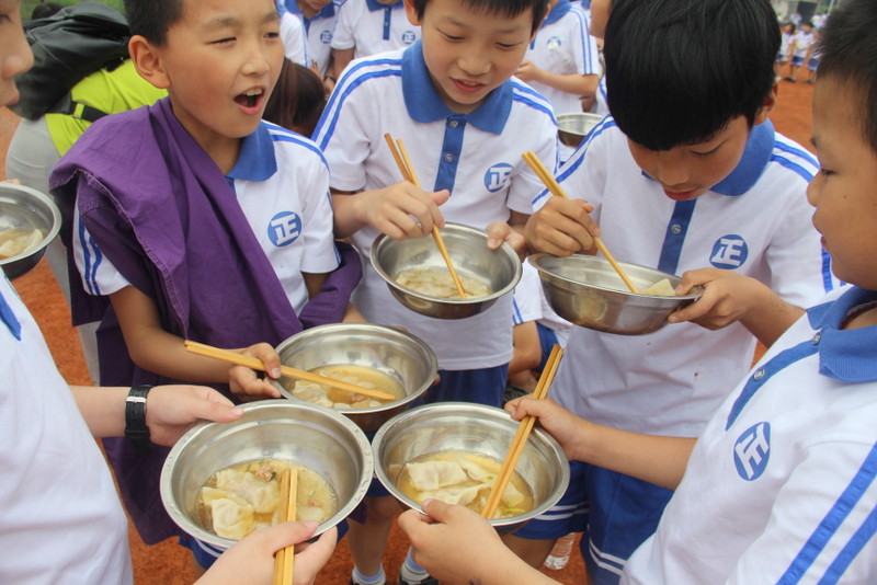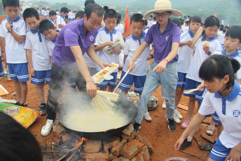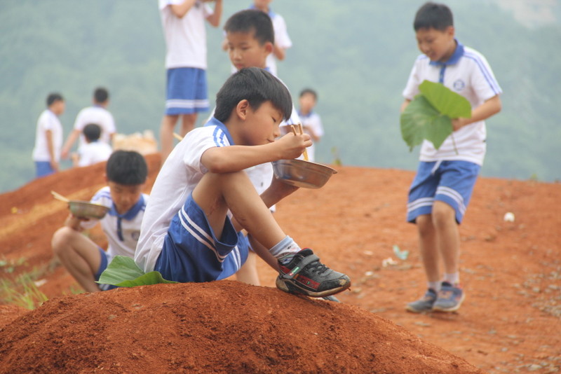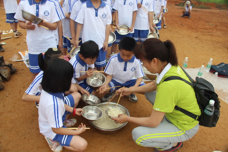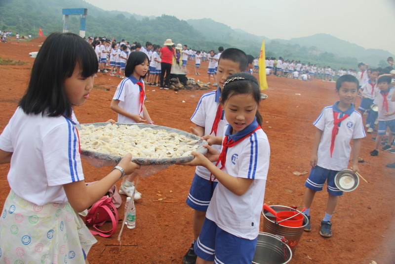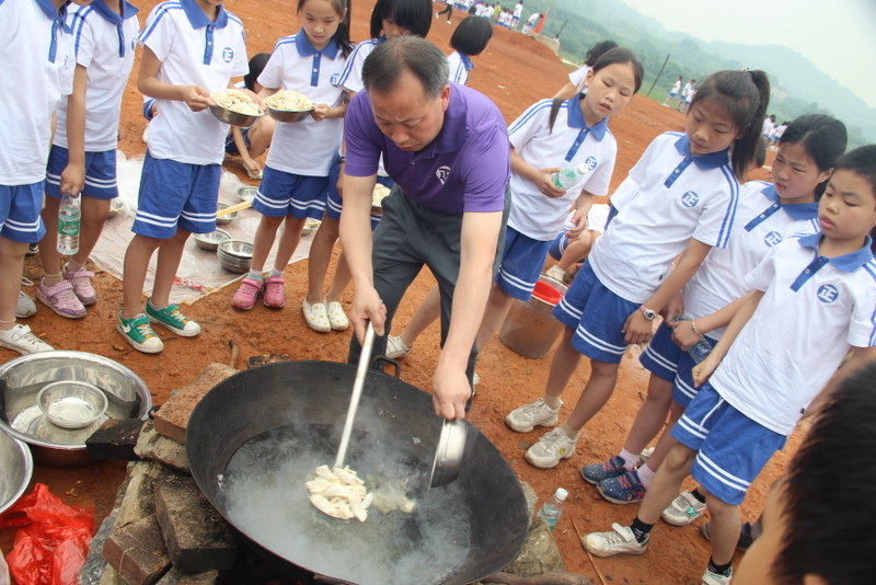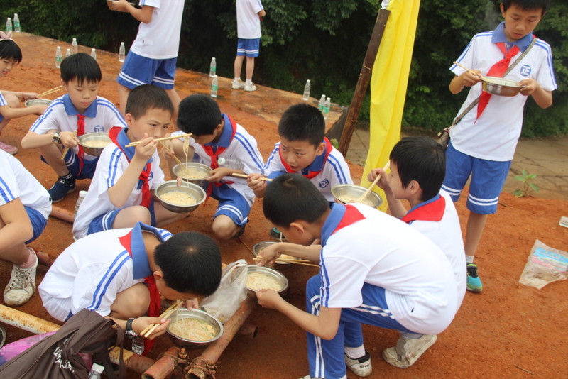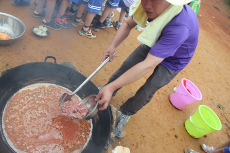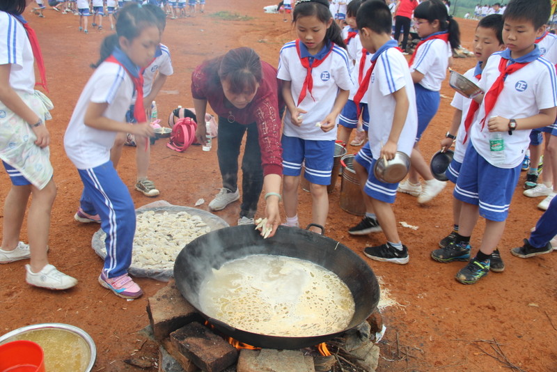 11:30左右,全年级13个班806名学生陆续到达目的地——鹿岐峰脚下,开始野炊。此时的太阳终于露出了它可爱的笑脸,初夏的阳光不毒却也不怎么温柔,热乎乎地洒在师生们身上。可孩子们不顾一路的辛苦,垒灶、打水、涮锅、洗碗筷,包饺子……火燃起来了,接着下面条,煮饺子,紧张有序,不亦乐乎。不一会,面熟了,饺子浮起来了,孩子们围着灶台等着开餐。这可忙坏了老师们。老师们不顾旅途疲劳与饥饿,不顾烟熏火燎,给孩子夹面,捞饺子,舀汤,一拨又一拨,乐此不疲。孩子们吃了一碗又一碗,大赞老师的厨艺。