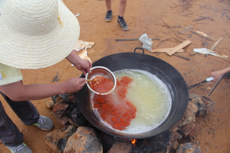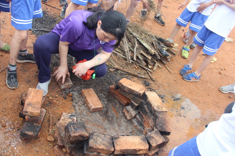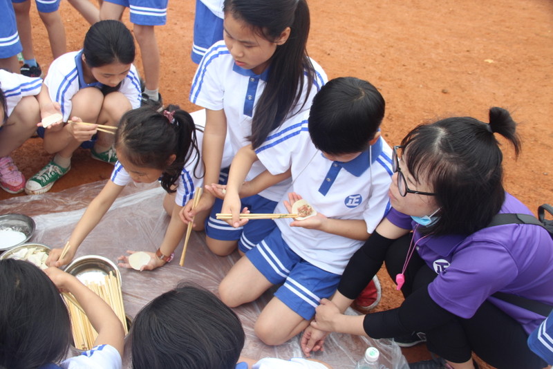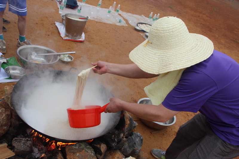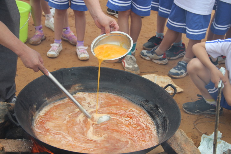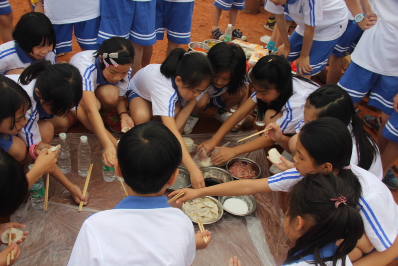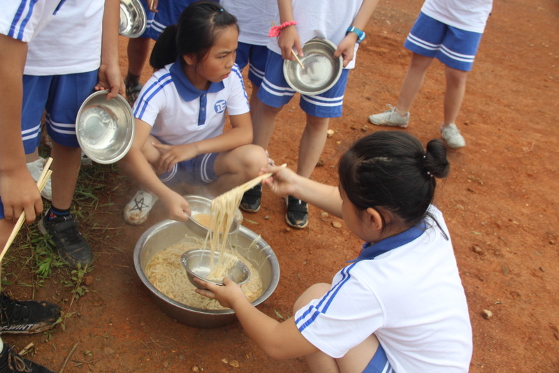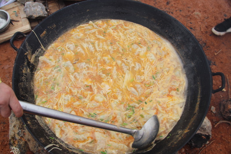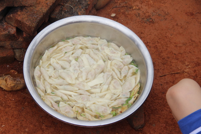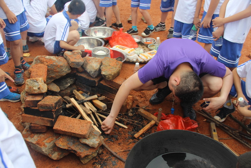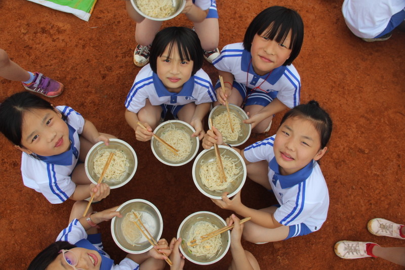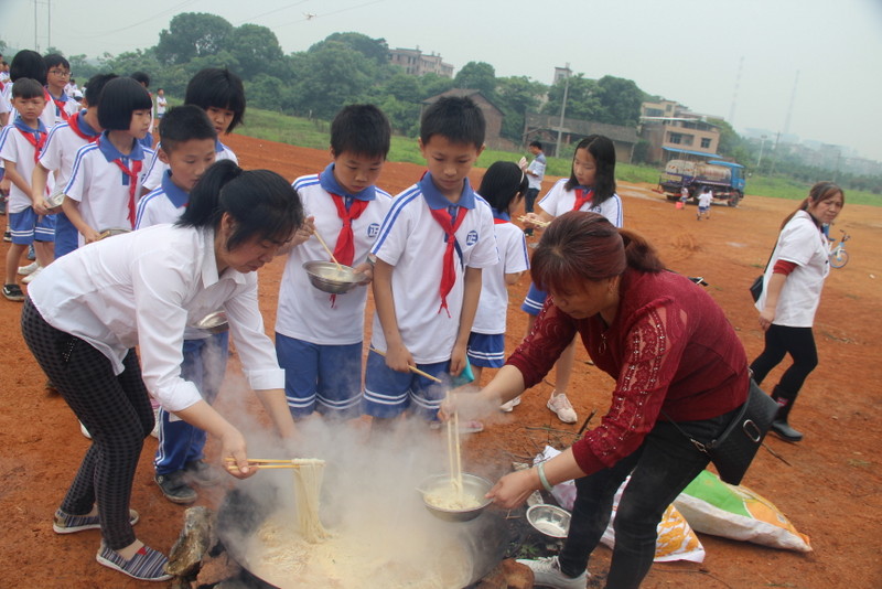 11:30左右,全年级13个班806名学生陆续到达目的地——鹿岐峰脚下,开始野炊。此时的太阳终于露出了它可爱的笑脸,初夏的阳光不毒却也不怎么温柔,热乎乎地洒在师生们身上。可孩子们不顾一路的辛苦,垒灶、打水、涮锅、洗碗筷,包饺子……火燃起来了,接着下面条,煮饺子,紧张有序,不亦乐乎。不一会,面熟了,饺子浮起来了,孩子们围着灶台等着开餐。这可忙坏了老师们。老师们不顾旅途疲劳与饥饿,不顾烟熏火燎,给孩子夹面,捞饺子,舀汤,一拨又一拨,乐此不疲。孩子们吃了一碗又一碗,大赞老师的厨艺。