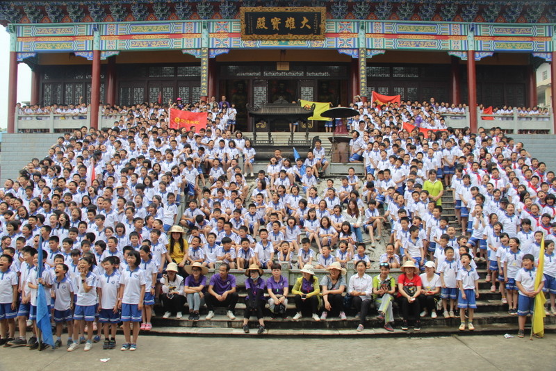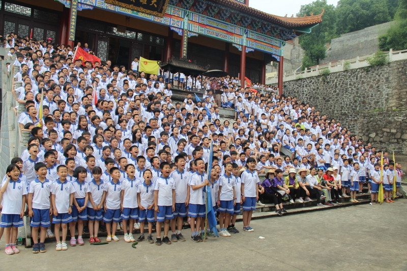 享受完自己下的面条、自己包的饺子的美味,收拾干净场地,一点左右,全体向鹿岐峰顶开拔。来到鹿峰寺,登上大雄宝殿,全校师生合影留念。接着沿着又弯又陡的山路,拾级而上。登上山顶,孩子们欢呼雀跃,“鹿岐峰,我来了!”。山上绿树红花,古木参天。极目远眺,城市、乡村尽收眼底。