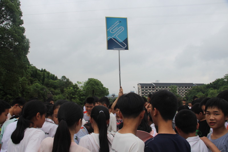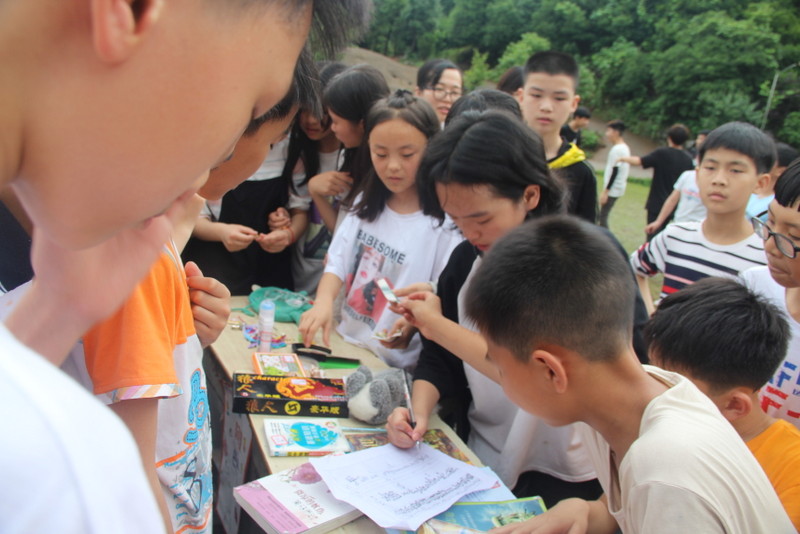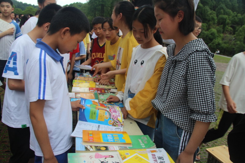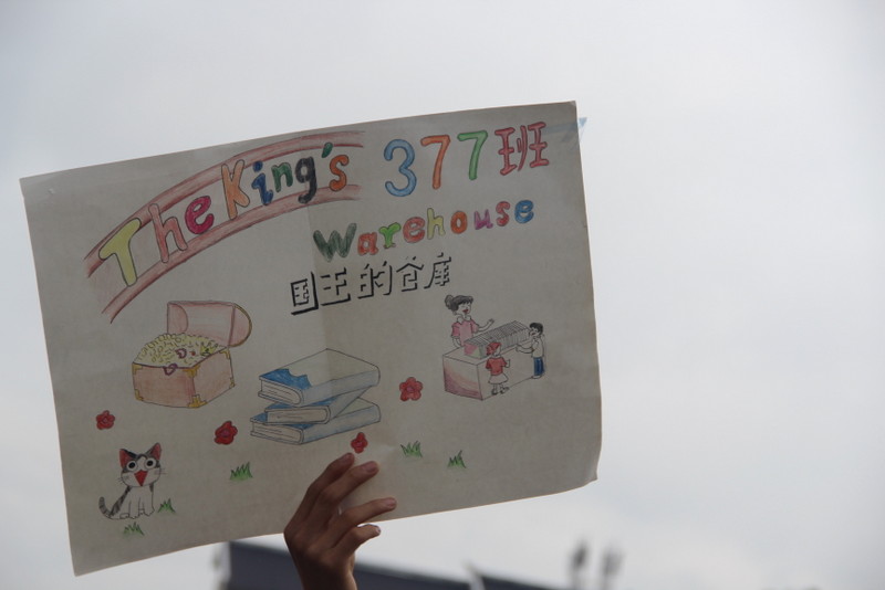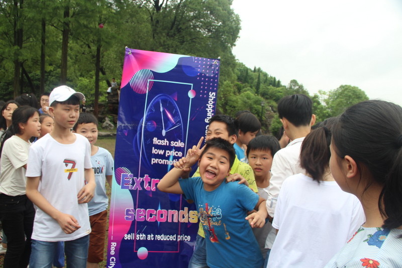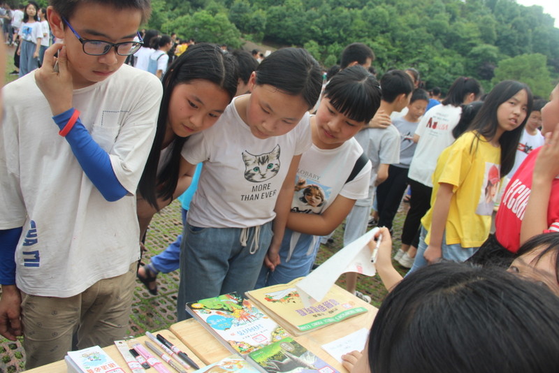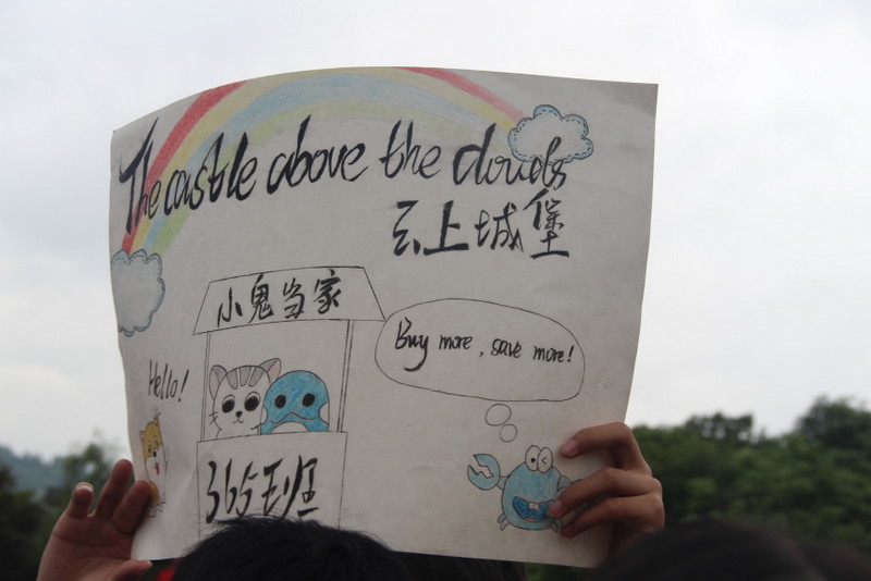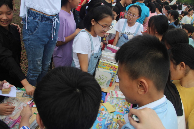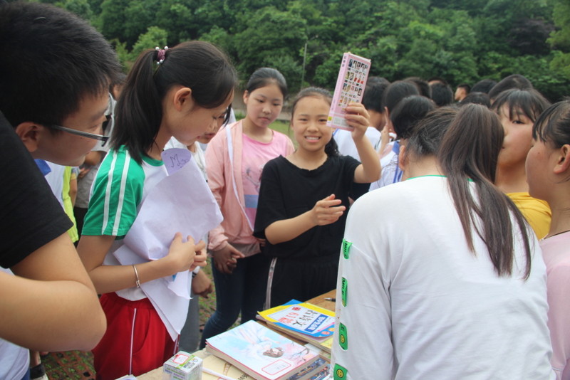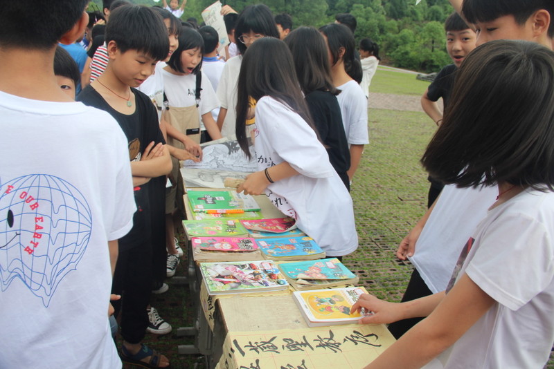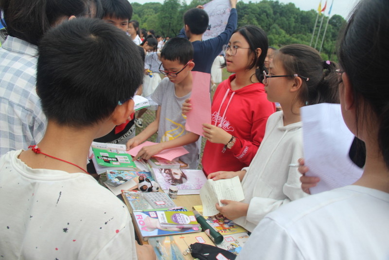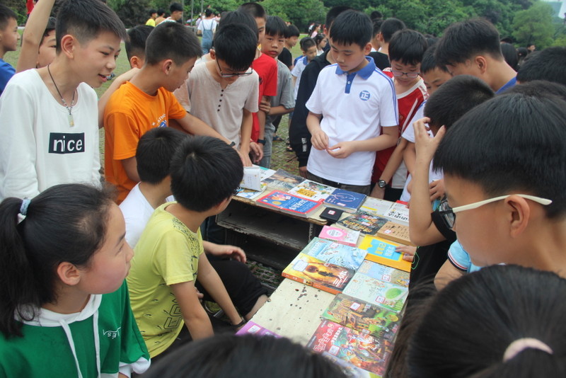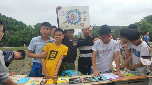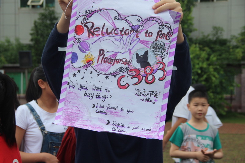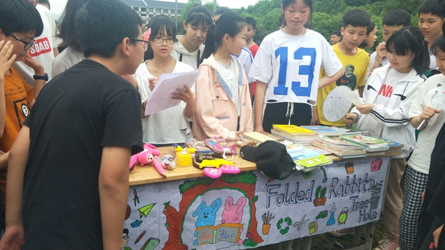 下午刚过4点,初一年级44个班陆陆续续地搬了桌子、椅子到广场指定位置,一个班一个摊位。学生们挂横幅、摆书籍,忙得不亦乐乎。4点45分,各个班都已经布置完毕。五彩缤纷的展板、鲜艳夺目的海报,都按照活动要求使用英语,小小的摊位被学生们布置得美轮美奂。各班级所售物品琳琅满目,从书籍、杂志,到布偶、文具,从发圈、镜框到手工艺品。前来淘宝的教师和同学淘在其中,乐在其中。