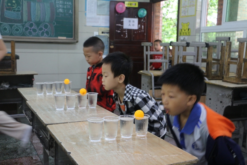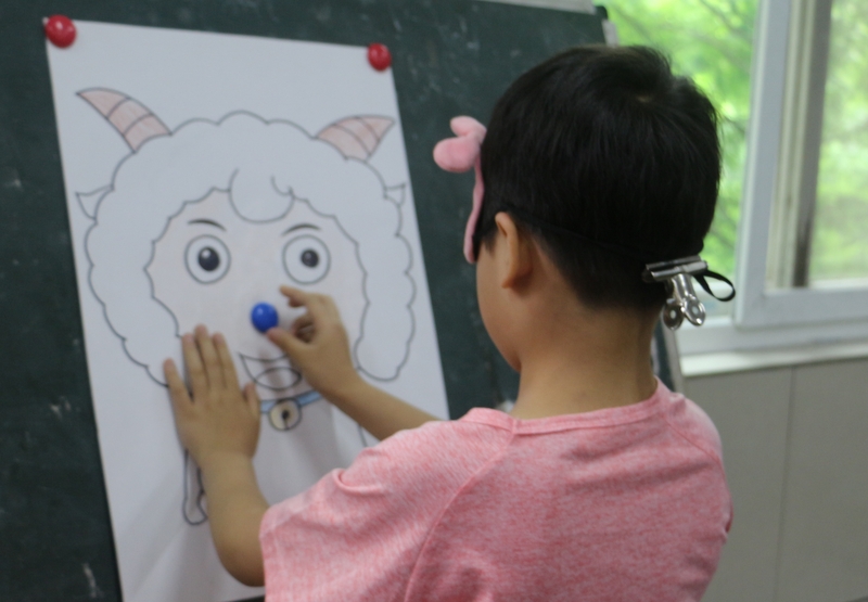 看完三楼游二楼。随着走廊上的人流不由自主地来到了356班的保龄球区,看到地板上分成两个游戏区,教室的一端每边摆着6个矿泉水瓶,,另一端有两个同学手持足球正在瞄准,然后弯腰出球,球飞快地滚到水瓶上,6个水瓶应声倒下,一轮游戏就此完成。旁边的许多同学见水瓶全倒,都不约而同地热烈鼓掌,并且学着这两人的方法上场击球。355班是用筷子夹乒乓球,一群同学围着桌子,桌上放了两盒乒乓球,有两名同学手持木筷,聚精会神地盯着乒乓球,小心翼翼地夹住它放到方盒中,正当球就要到盒子中时,这个同学一个不留神,手轻轻抖了一下,球就从筷子中间掉落到地上。看似简单的事,还真需要技巧。354班是口吹乒乓球,你瞧,356班的周浩明同学正弯腰趴在桌子边,他的面前三个装满水的杯子排成一条直线,在靠近他嘴边的杯子上浮着一个乒乓球,只见他用嘴巴撮成O 型凑近杯子上的乒乓球,用力地往前吹,乒乓球从第一个杯子的水面上漂到了第二个杯子,接着又漂到第三个杯子上,瞬间完成了游戏。别的同学可能方法不对,有些把球吹到了桌上,还有些把水吹到了自己脸上,看起来让人忍俊不禁。353班是贴鼻子,一个孩子站在画作前,看准了图上动物的鼻子所在,接着蒙着眼睛转一个圈,再把手上的鼻子贴到图上动物的相应部位上,可能转的有点晕,他没有把鼻子贴到位,而是把鼻子贴到了眼睛上,逗得大家哈哈大笑。