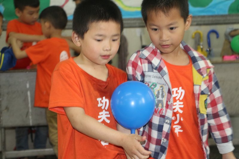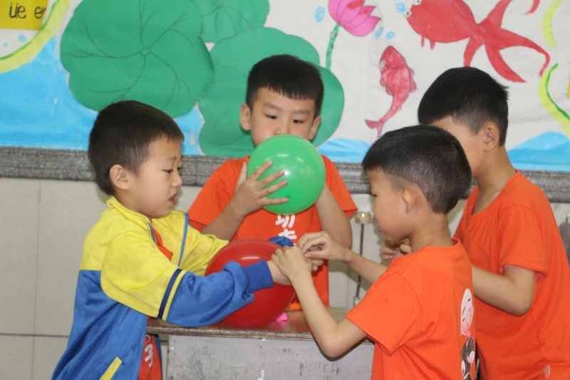 首先来到的是358班,教室里早已经是接踵摩肩地排起了长龙,走近一看,好不热闹。只见358班的贺誉、刘智超等5人分工合作,两个吹气球,一个扎气球,贺誉和刘智超两人迎面而立,把吹好的气球夹在两人的胸膛之间用力挤压,不一会就响起了气球的爆炸声;357班和354班各有一组同学加入比赛,整个教室就像一个气球大战的战场,孩子们就像一个个大战气球的勇士,只听得爆炸声此起彼伏,真是既惊险又刺激,令人热血沸腾,跃跃欲试!