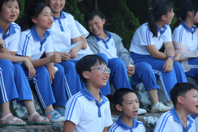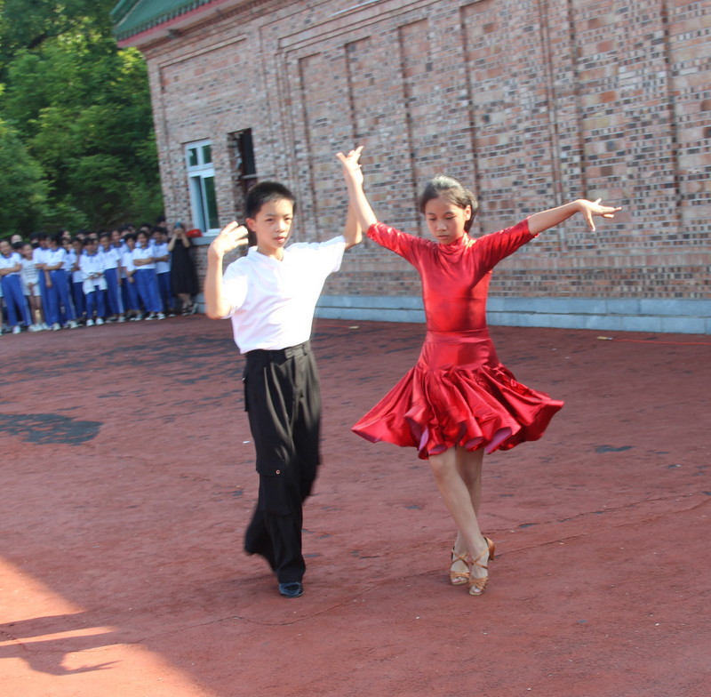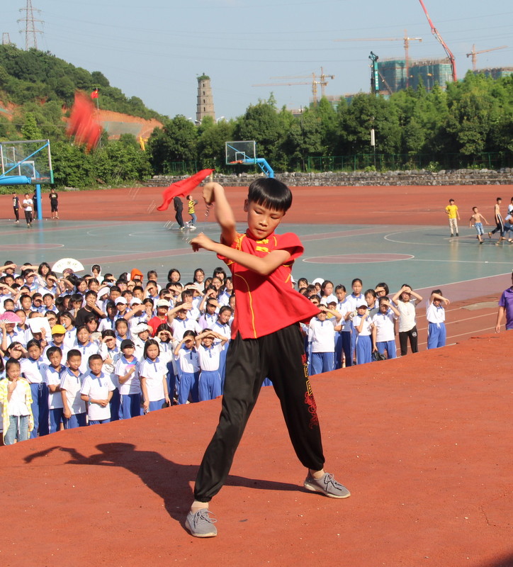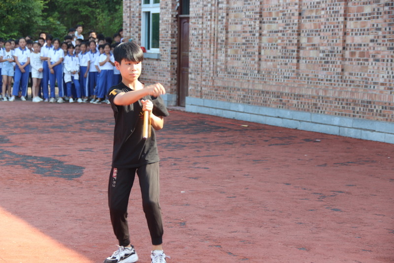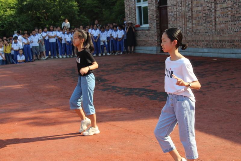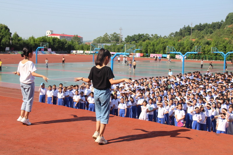 下午3点半,同学们穿着洁白的校服,排着整齐的队伍,顶着仲夏的骄阳,在初中部运动场欣赏了为跳绳比赛热场的精彩节目。392班廖曼菲、廖子璇同学表演的现代舞《咖喱咖喱》,396班、400班李海洋、陈明带来的武术表演,390班资骞、陈佳妮献上的拉丁舞《Hush Hush》,以及403班蒋佳杰、邓亮等同学合唱的歌曲《寒鸦少年》,这些多才多艺的同学和他们精彩表演,迎来了观众们热烈的掌声和欢呼声。