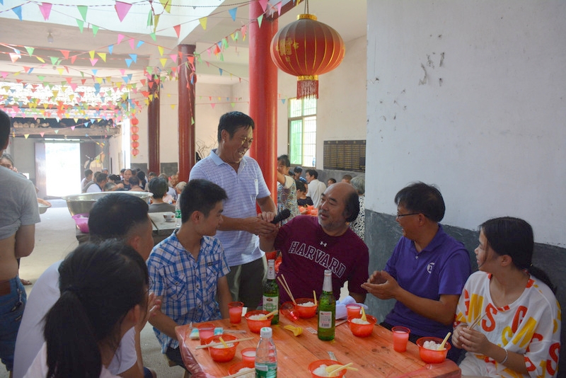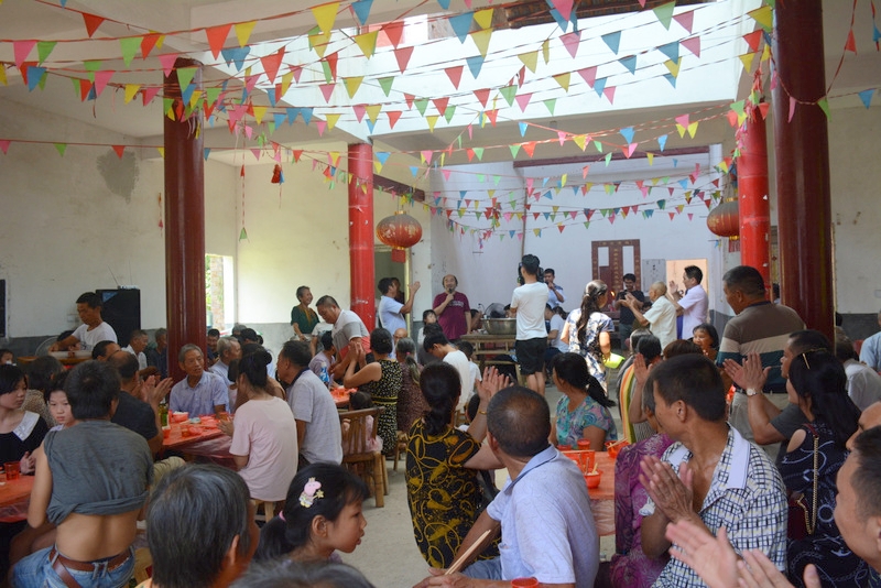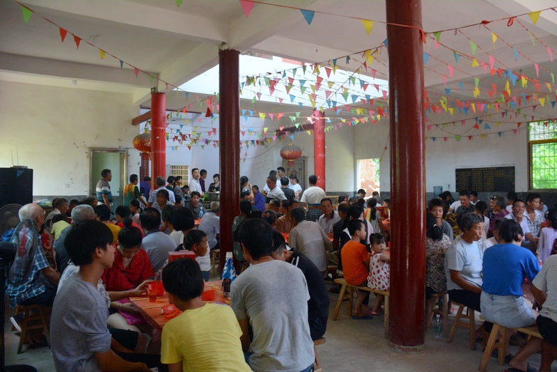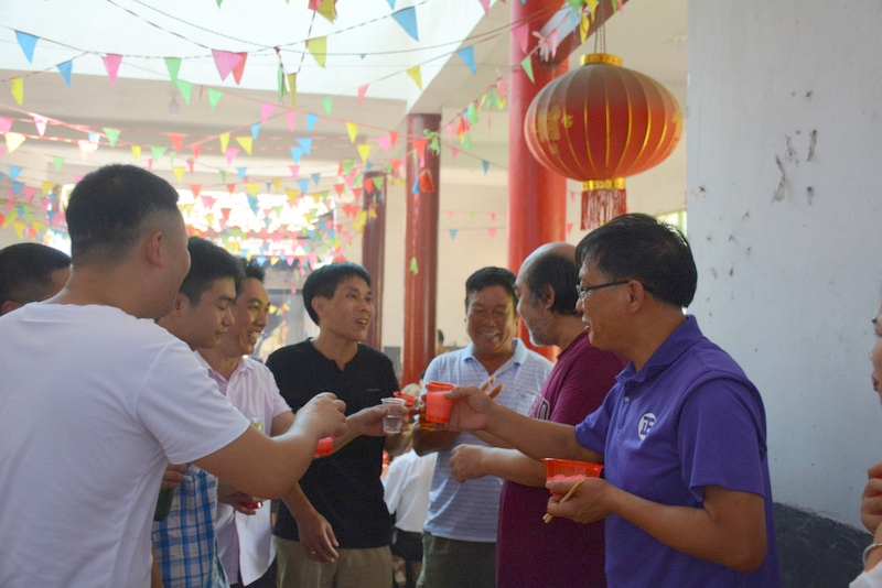7月29日,大市镇紫峰村上堂片的祠堂里人声鼎沸,祠堂门口对联高挂,门外鞭炮齐鸣,热闹非凡。紫峰村上堂片支书贺军武说,只有村里遇上了大喜事,祠堂才会有这样的布置,村民们才会欢聚一堂,同举高杯。