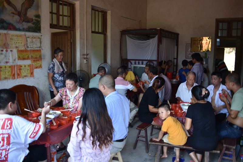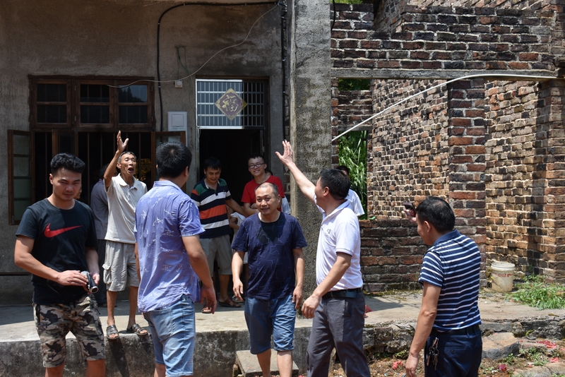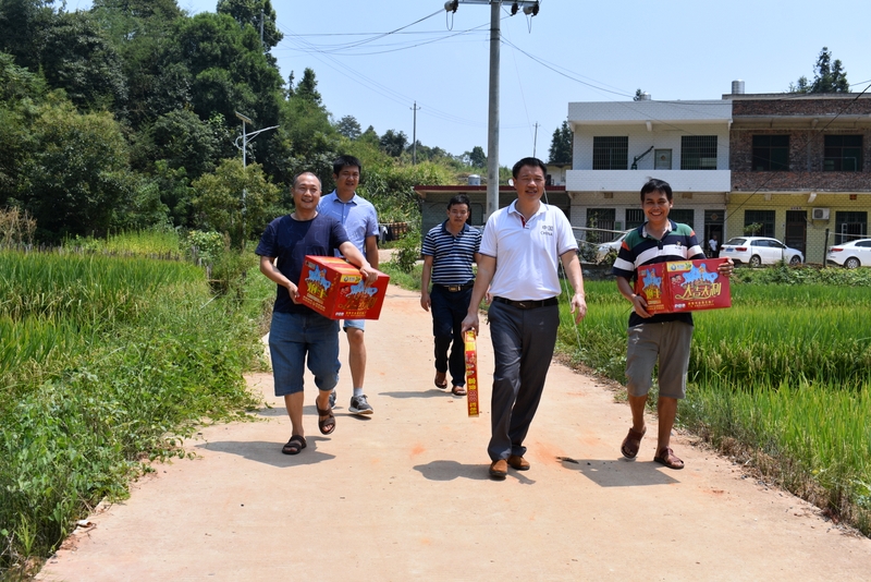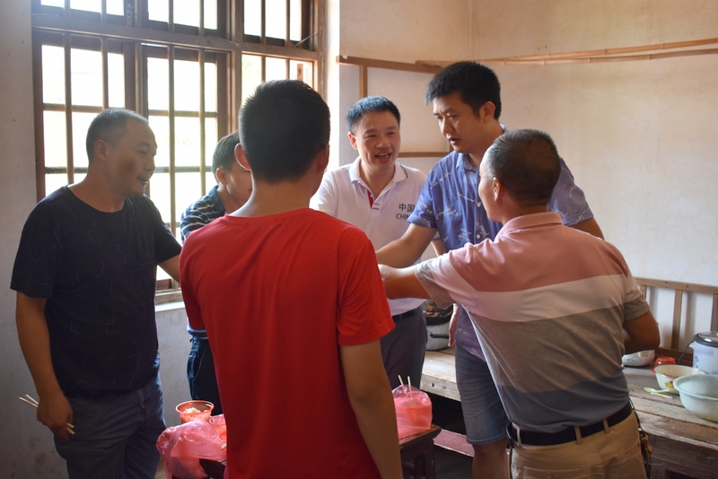 8月19日,应谭诗彪同学邀请,班主任董志成、初中班主任及招生老师一行,驱车至东湖圩镇小山村参加其升学宴。从正源出发,大约40分钟车程,两台校车停在村口,谭诗彪父亲谭务廷迎了上来,因为村口有人建房,只能步行穿过农田,谭务廷满脸愧疚的把老师们往家里请。