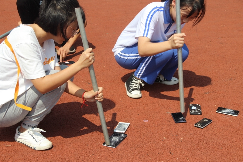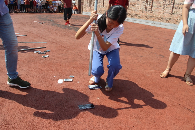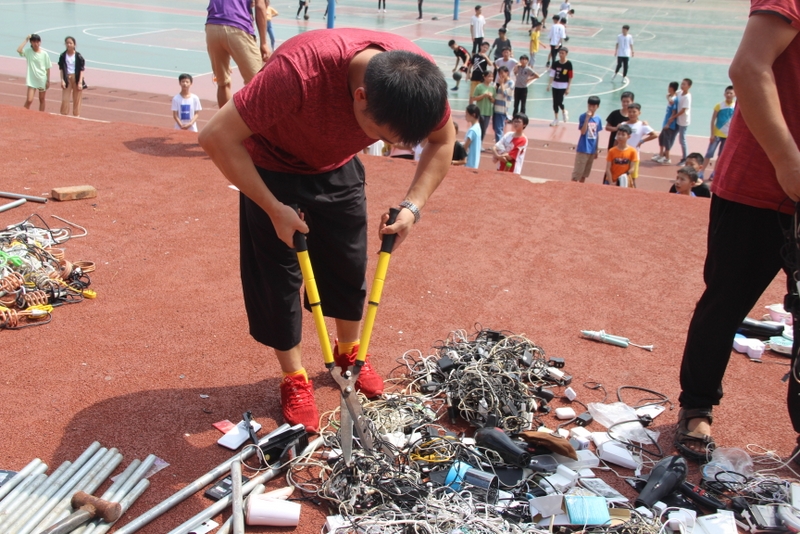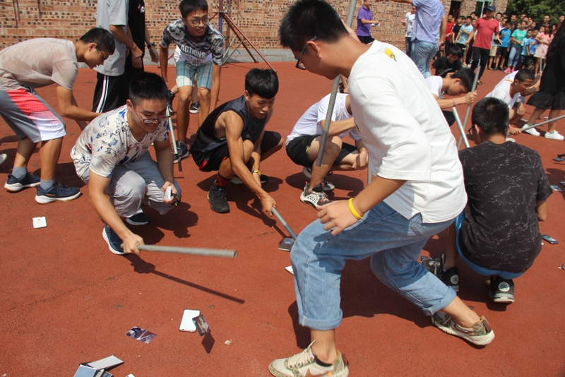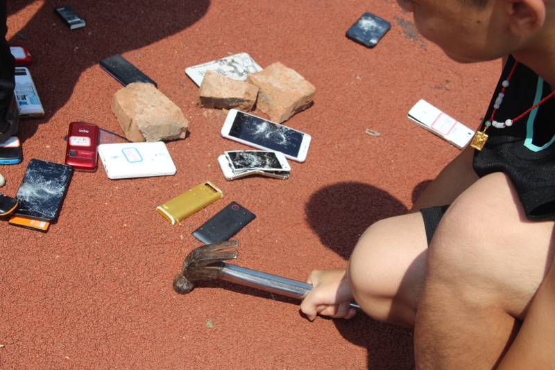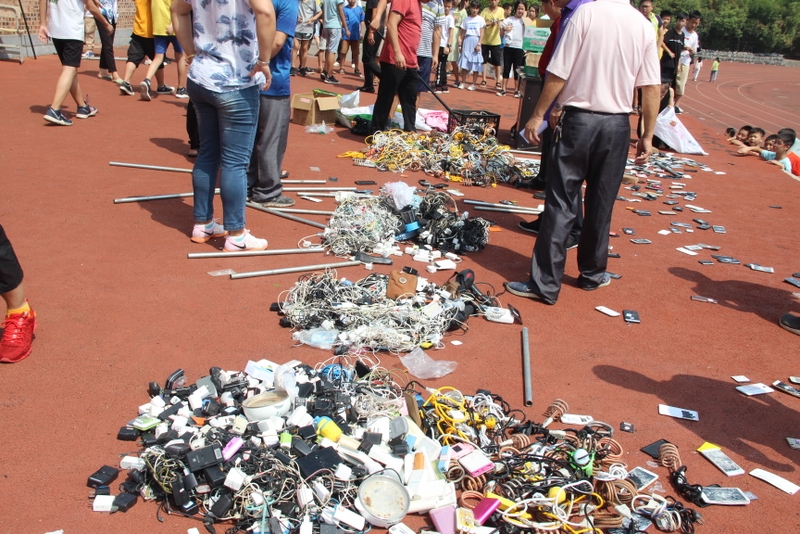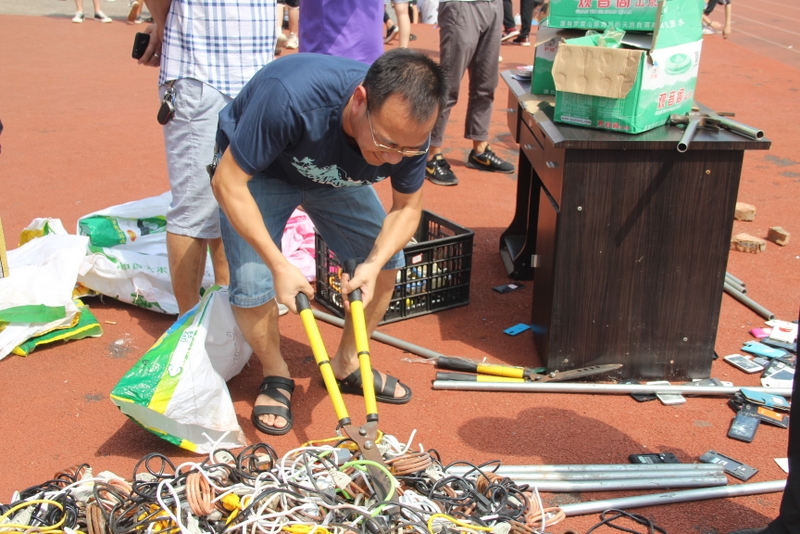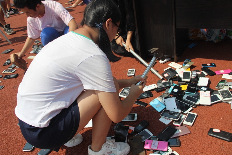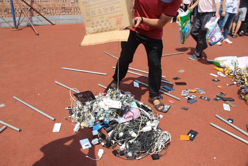 之后,部分学生代表走上主席台,他们拿起锤子、剪铗、钢管,将近年收缴的300多部手机、MP3、MP4等视听产品粉身碎骨,将热得快、充电器等物品的电线剪得稀乱,噔噔噔噔的敲砸声,咔嚓咔嚓的剪切声震撼着大地,震撼着每一个学生的心灵。