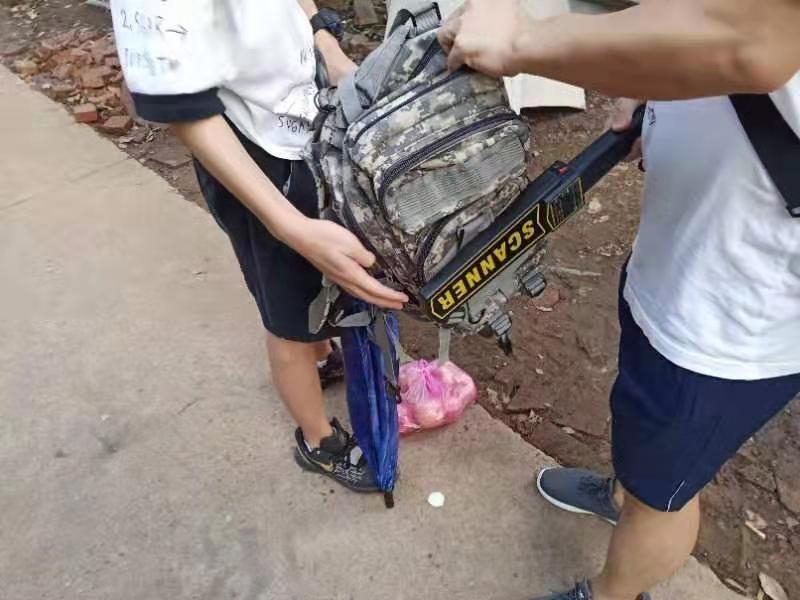 9月11日晚放假前夕,学校德育处即要求全校各年级、班级向家长转发学校相关要求,明确返校时间所有学生不能携带垃圾食品、牛奶及违规电器进校园。9月15日下午,小学部、初中部、高中部组织行政领导及老师在学校南门、西门、东门分别设卡,拉开检查网,对进校学生采用金属检测仪检查手机,要求学生自行开包检查其他违规物品。对于查获的违带物品,或者现场由家长直接带回,或者先行没收,待下次学校放假时学生带回。