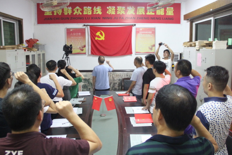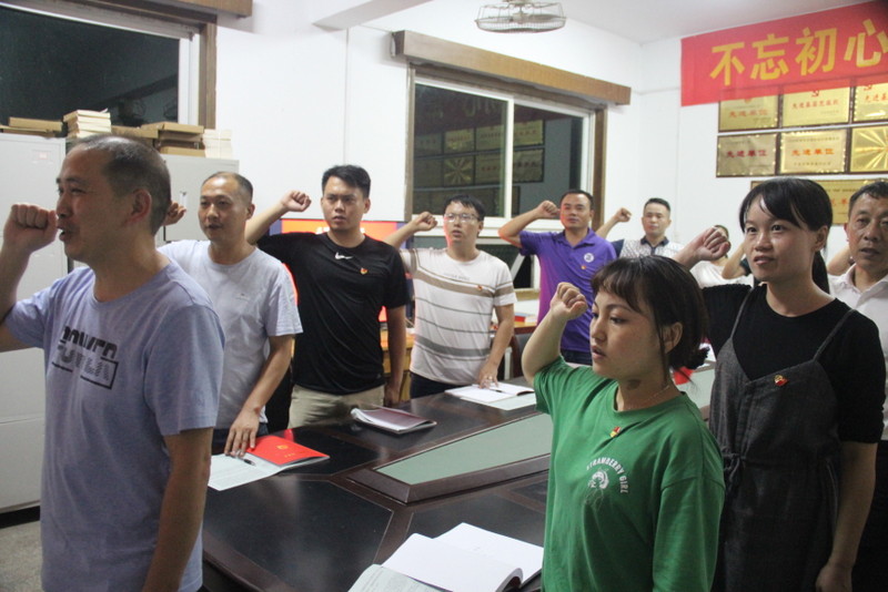 会上,党员们全体起立,举起握拳右手,重温入党誓词,庄重严肃,音色铿锵。