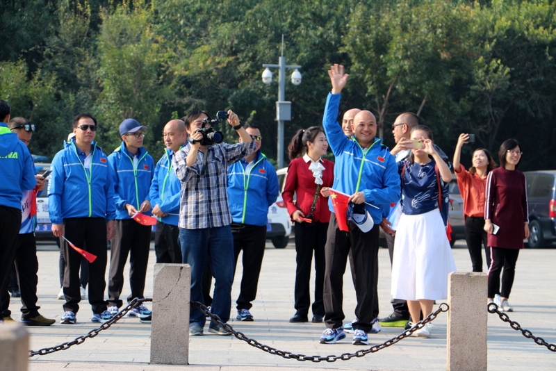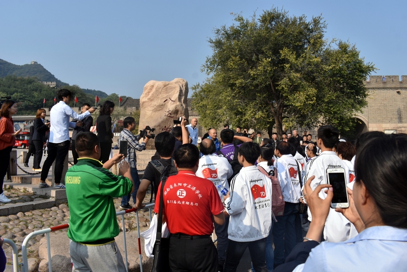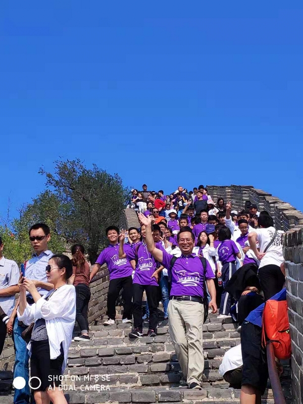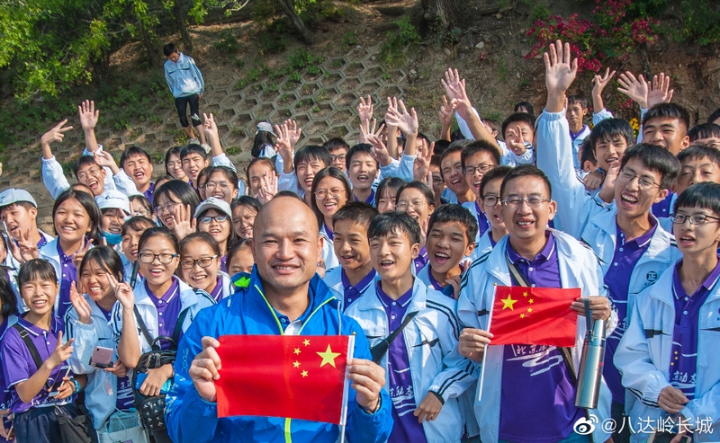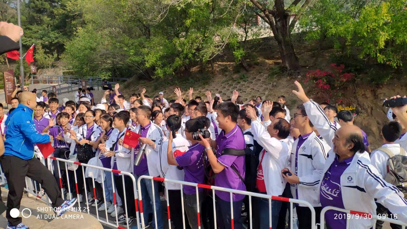 步行到登长城的入口,还没有开闸,游客不能入内。却见一班扛着摄像机的记者在采访包括一个光头在内几个着装一致的人,正源人凭着以往一贯对时政的关注,马上意识到这可能就是应邀前来北京参加新中国成立70周年庆典的香港“光头警长”刘Sir一行。同学们马上围拢来,高喊“刘Sir,我们挺你!”“刘Sir,我们挺你!”不出所料,正是刘Sir。只见刘Sir拿着手中的小国旗,笑容满面地走到同学们的面前,亲切地与同学们打招呼,双手抱拳,连声说道:谢谢你们!谢谢你们!叮嘱同学们要好好读书,并与正源师生一起合影,为同学们留下珍贵的记忆。刘Sir离开后,正源师生再一次高喊:我们爱香港!我们爱祖国!