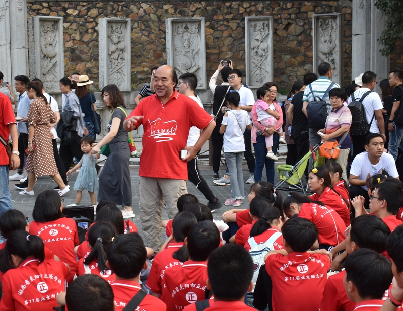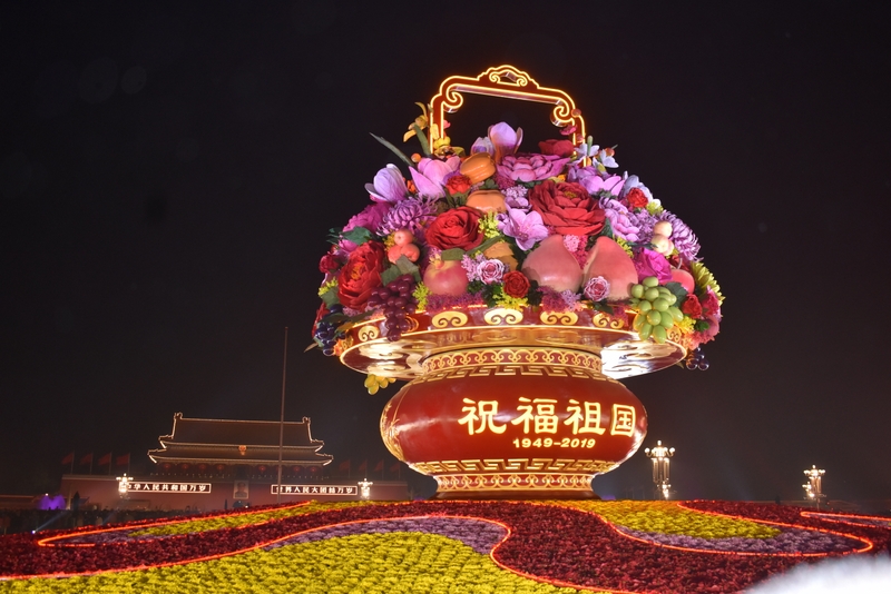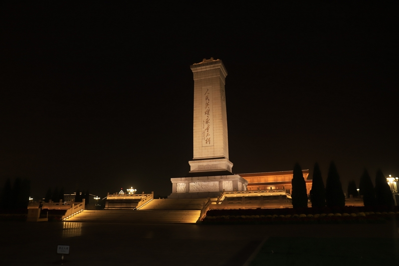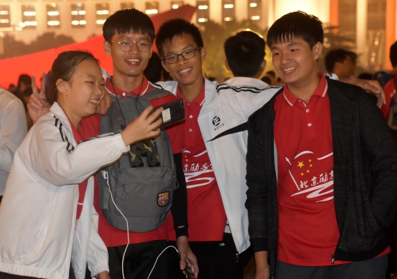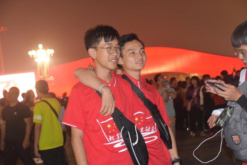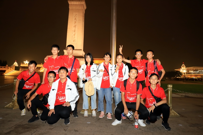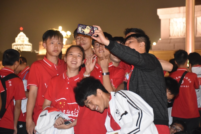 晚上,同学们来到天安门广场观赏国庆期间的美丽夜景,在人民英雄纪念碑前纷纷拍照留念,全体同学以福字大花篮和天安门城楼为背景合影留念。