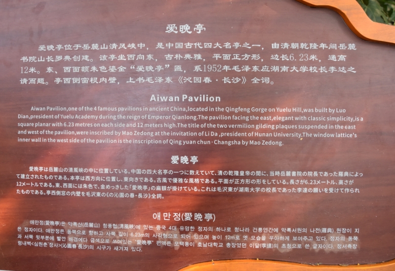 爱晚亭内面上方悬挂着毛泽东《沁园春·长沙》词牌匾