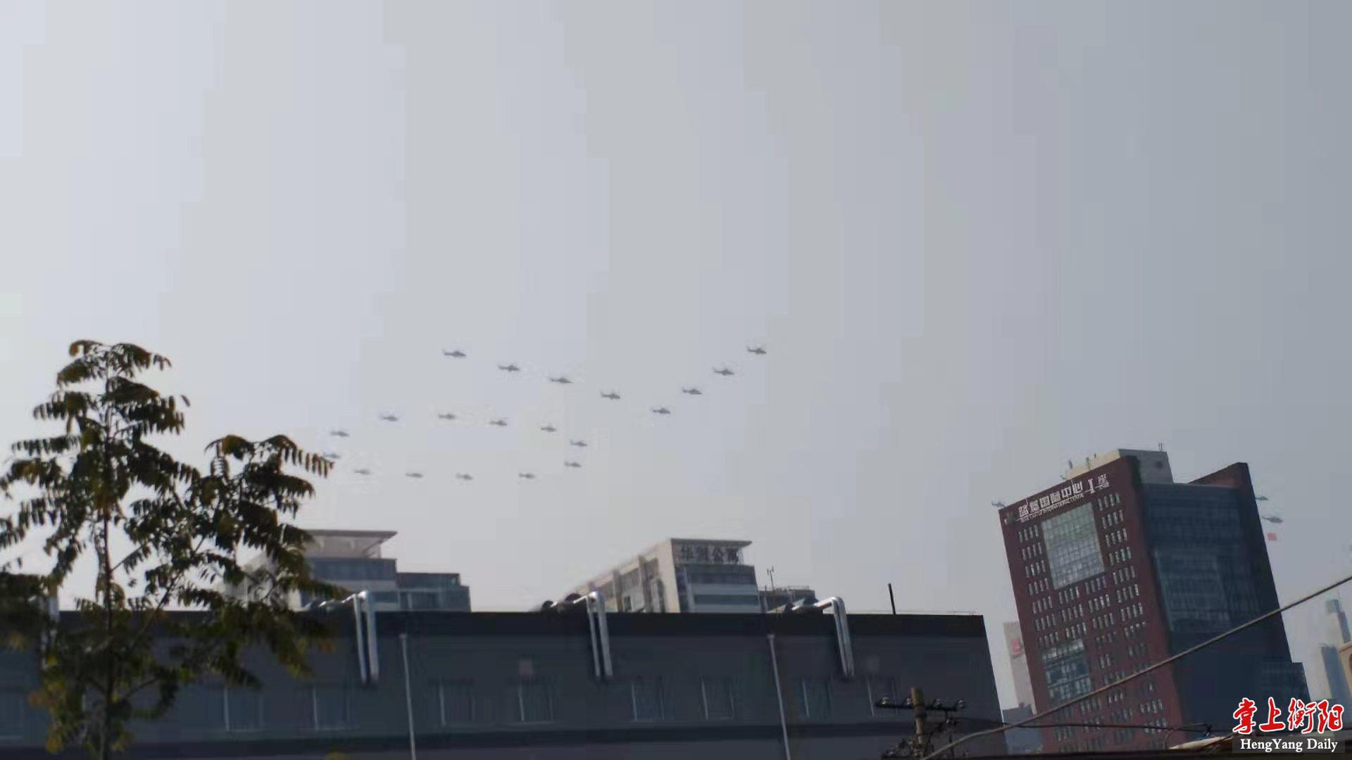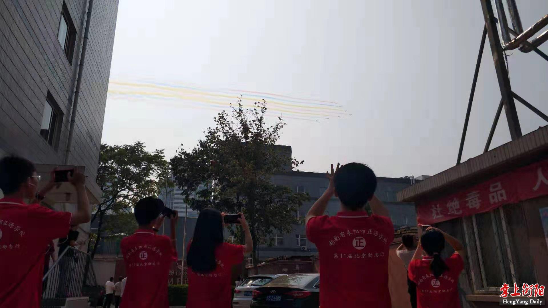 记者来到朝阳路,街上车辆和行人出奇的少,这是记者在北京很少见到的场面。应该,这时候不是在现场观看庆祝大会,就是在家里看电视直播。过了一段时间,一群群排着各种阵型的飞机从头顶上飞过,记者立即用相机拍下了这难忘的镜头……