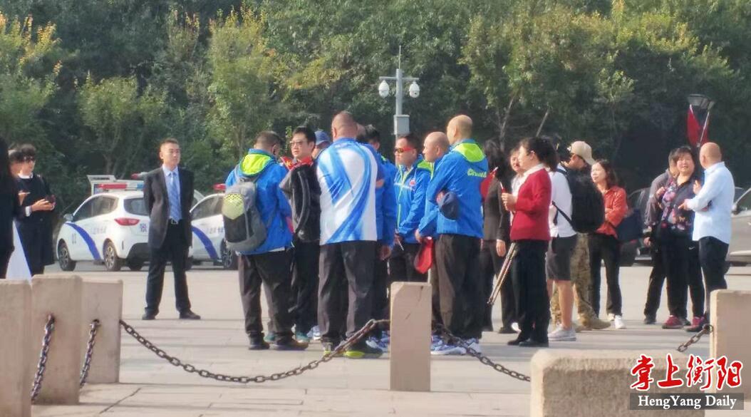 9时12分,师生们来到八达岭长城脚下的大坪外,准备像往年一样到坪内合影。当时保卫人员告知他们暂时不能进。只见几位扛着摄像机的记者正在坪内采访一群人。“光头刘Sir!”突然,正源学校校长助理蒋智敏惊奇地叫了起来。“刘Sir,我们挺你!”他情不自禁地大喊了一声。没想到那光头男子听后立即回过头向师生们挥手致意!真是港警刘泽基!师生们喜出望外,立即齐声高呼:“刘Sir,我们挺你!”刘泽基听后立即挥手跑向师生致谢。他站在护栏前,亲切地问同学们上几年级,是哪所学校的。同学们告诉他,他们是耒阳市正源学校高一学生。“谢谢你们!”他再次致谢,并叮嘱同学们好好学习。随后,他主动和师生们合影留念。据悉,刘泽基与另外9名香港警察是受邀来北京参加国庆典礼的。30日上午,特地来登长城的。
