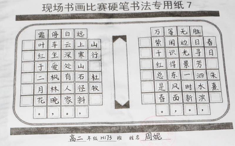 | 292 | 高二 | 173 | 周妮 | 硬笔 | 一等奖 |
