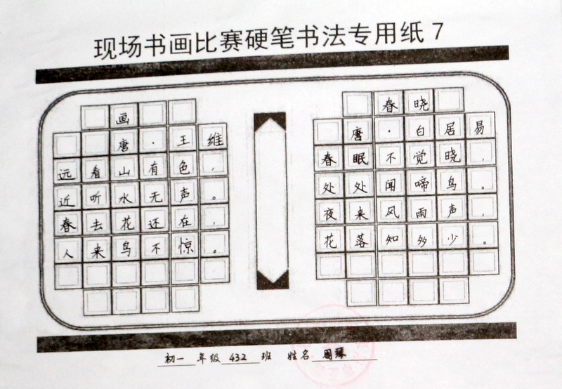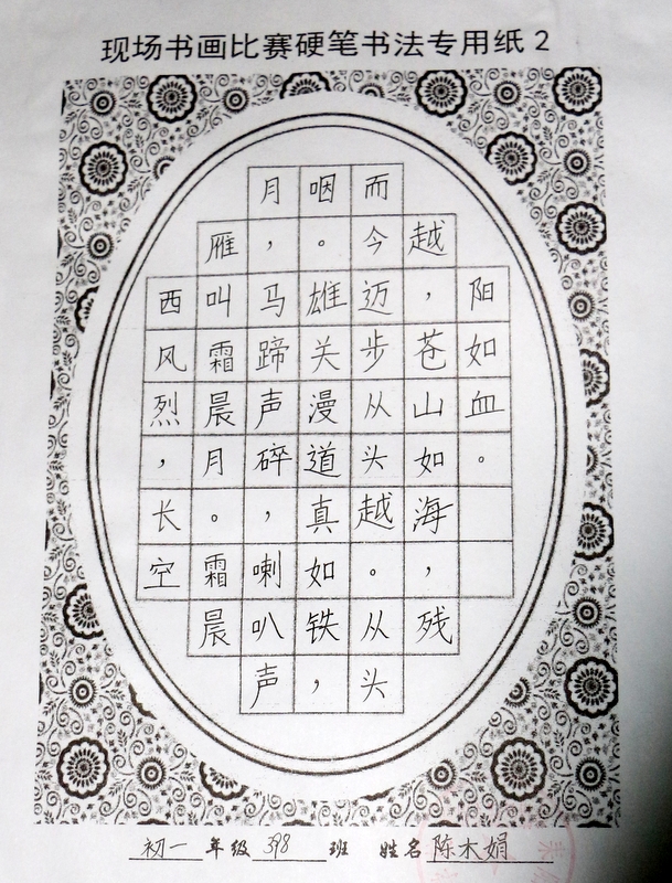 | 323 | 高二 | 175 | 陈欣怡 | 硬笔 | 优秀奖 |