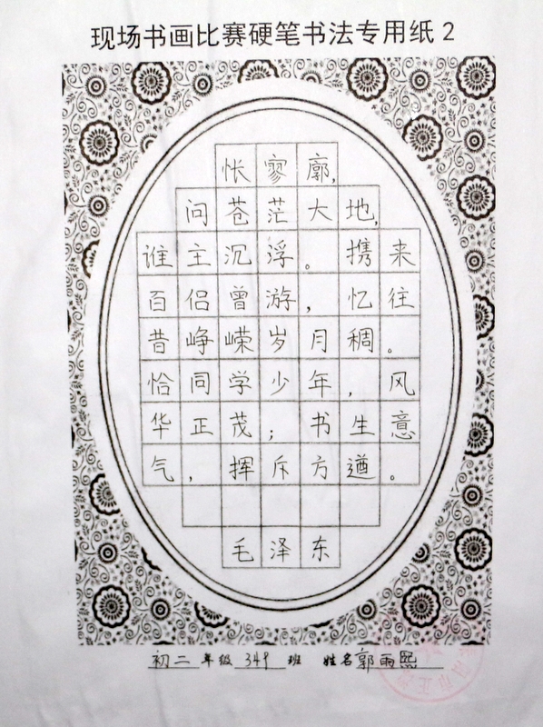| 268 | 高一 | 196 | 郑圆 | 硬笔 | 二等奖 |