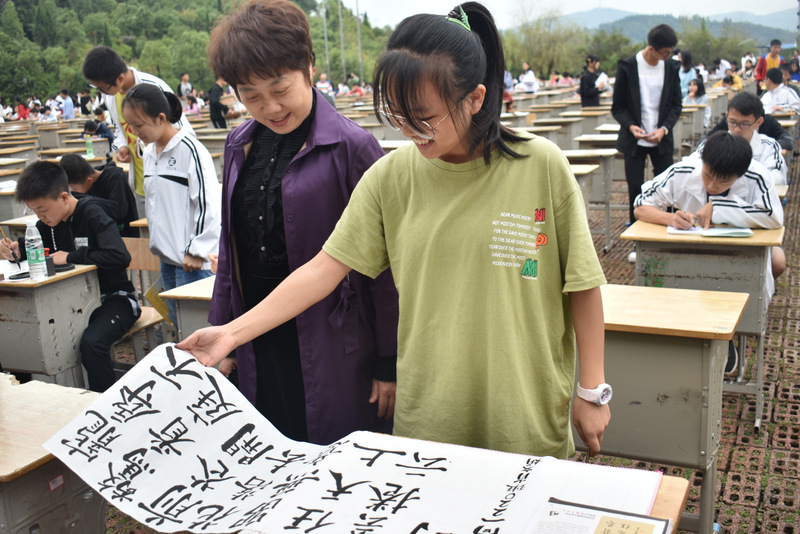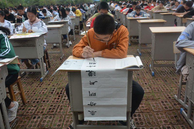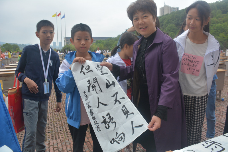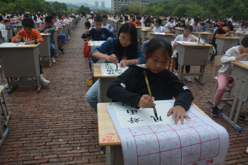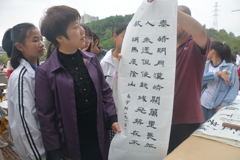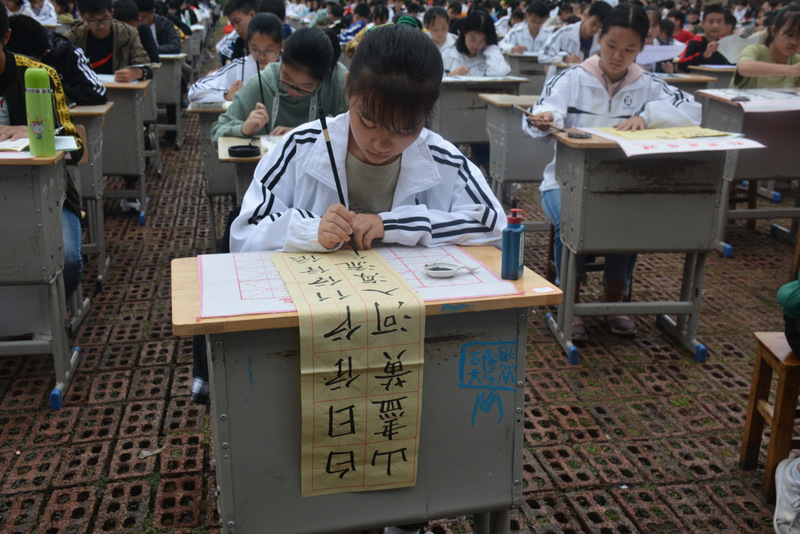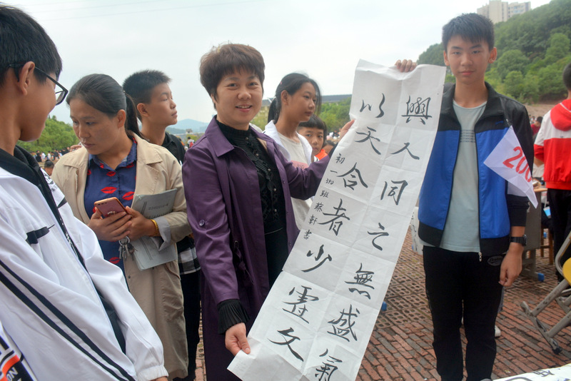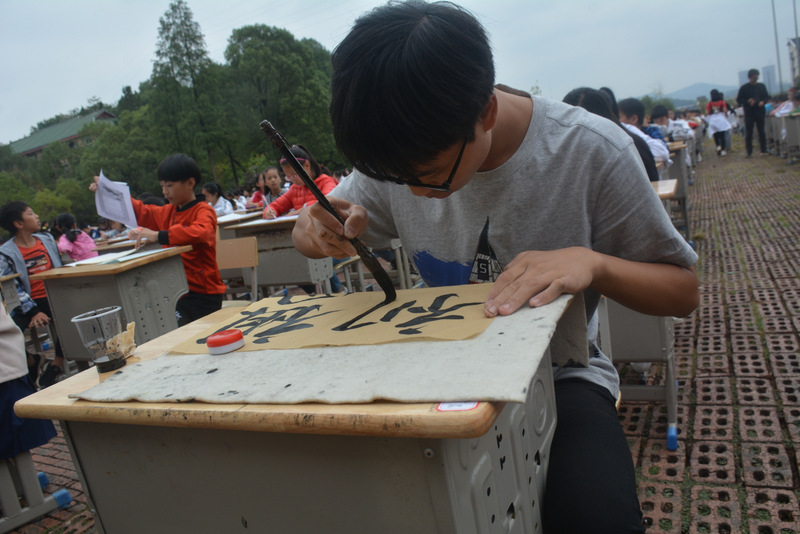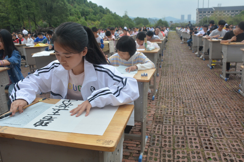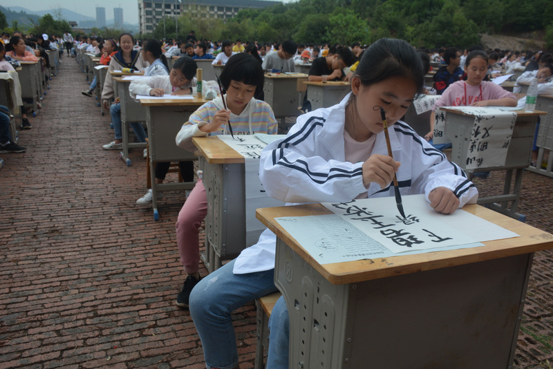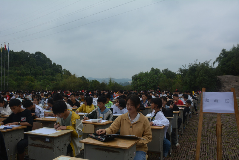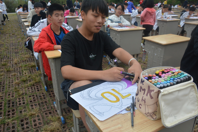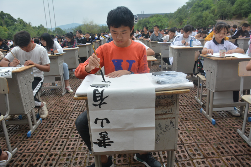 学校广场举行的是第三届中学生体育艺术节千人书画大赛。说是千人大赛,实则报名参与硬笔书法大赛的有1253人,毛笔书法大赛133人,绘画比赛807人,总共2193人。在这里,我们看到了书法老师为庆祝建国70周年、缅怀开国领袖毛泽东、弘扬中华民族传统文化而精心选择的书写内容,毛泽东青少年时期写的《五古·吟天井》《七绝·咏蛙》《七绝·赠父诗》《沁园春·长沙》《沁园春·雪》等大量诗词,以及李白、杜甫、王维、白居易、苏轼、陆游等唐宋名家的名篇赫然在列,同学们既展示了自己的书写功力,又获得了品读品写名人名作的美的熏陶。