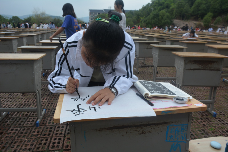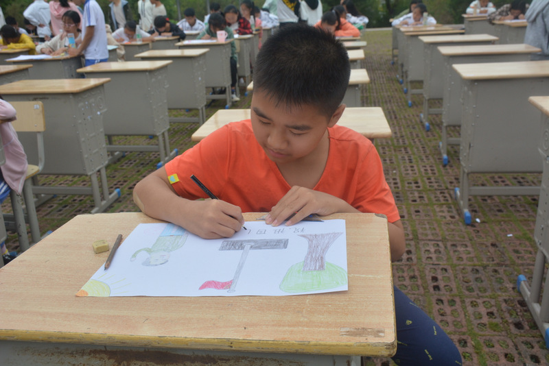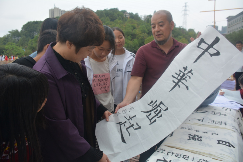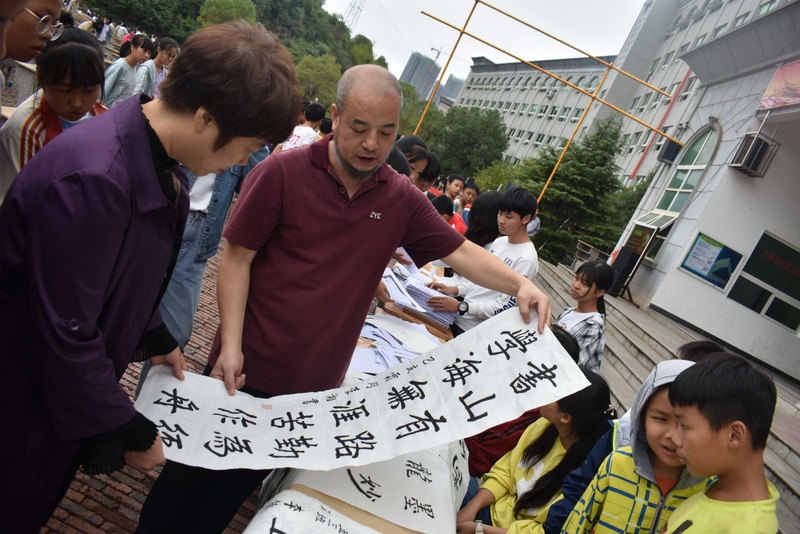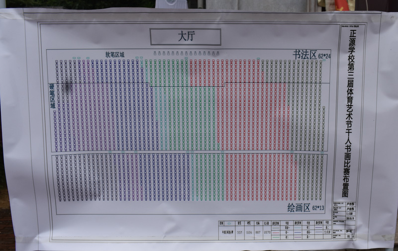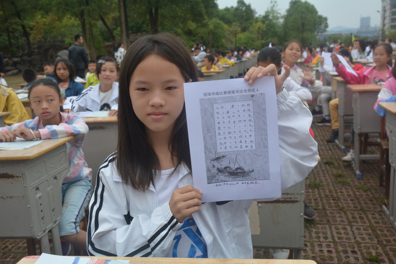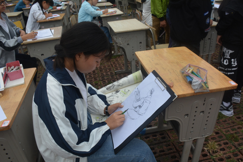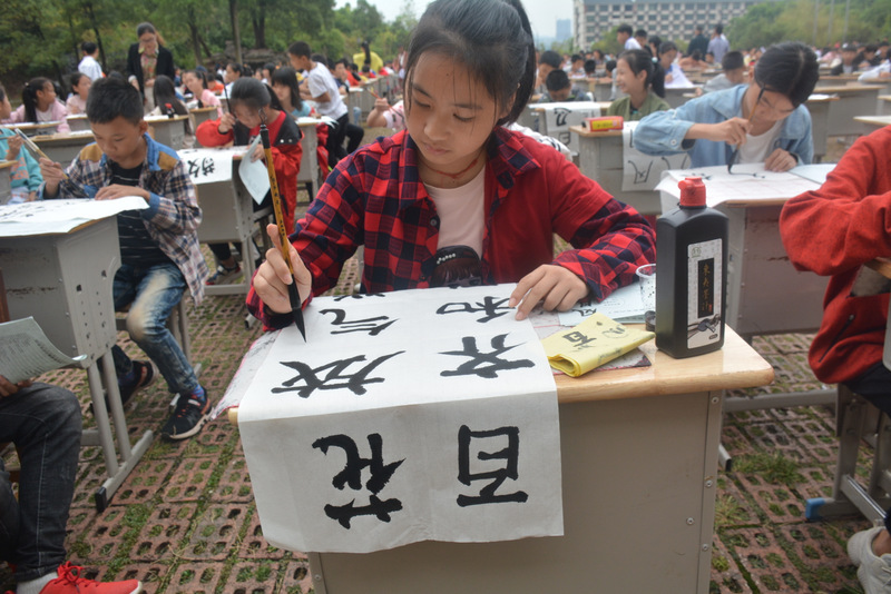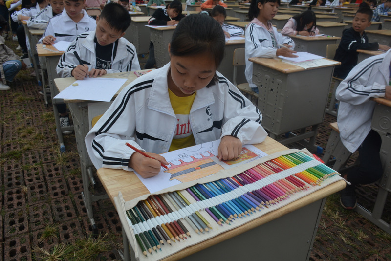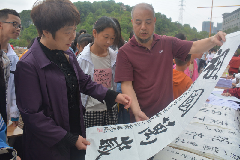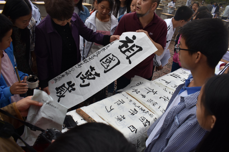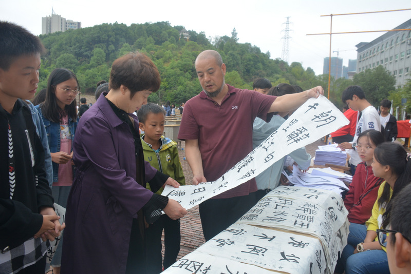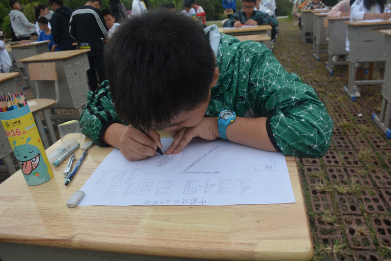 学校广场举行的是第三届中学生体育艺术节千人书画大赛。说是千人大赛,实则报名参与硬笔书法大赛的有1253人,毛笔书法大赛133人,绘画比赛807人,总共2193人。在这里,我们看到了书法老师为庆祝建国70周年、缅怀开国领袖毛泽东、弘扬中华民族传统文化而精心选择的书写内容,毛泽东青少年时期写的《五古·吟天井》《七绝·咏蛙》《七绝·赠父诗》《沁园春·长沙》《沁园春·雪》等大量诗词,以及李白、杜甫、王维、白居易、苏轼、陆游等唐宋名家的名篇赫然在列,同学们既展示了自己的书写功力,又获得了品读品写名人名作的美的熏陶。